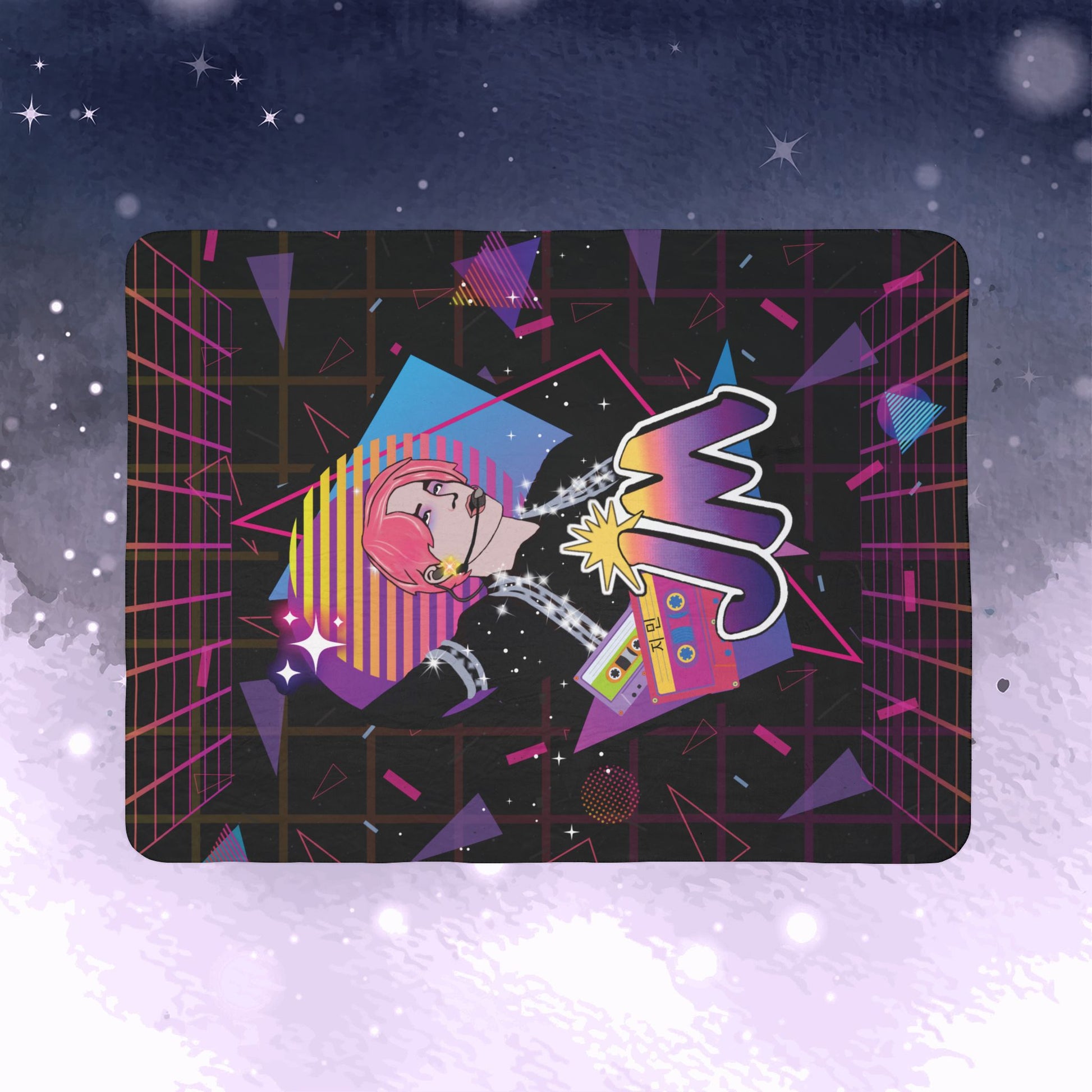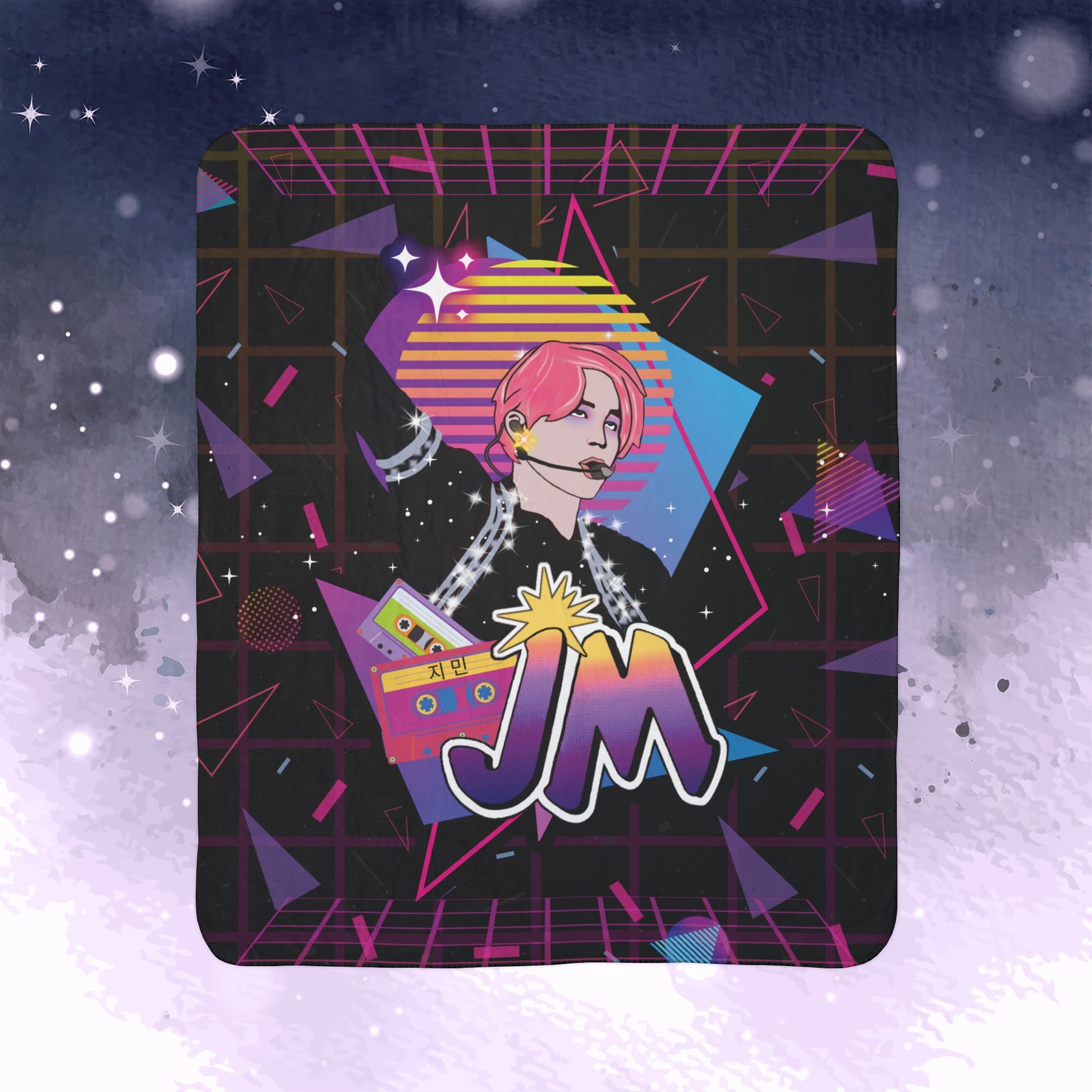 Level up your space with this show-stopping, large-format Jimin! This incredible piece of Jimin art captures the essence of 1980's pop music with a bright, neon and abstract vibe. Part of the exclusive Retro Series by ARMY Project 529, this blanket is designed by ARMY, for ARMY, to bring joy and color to your Bangtan home decor.