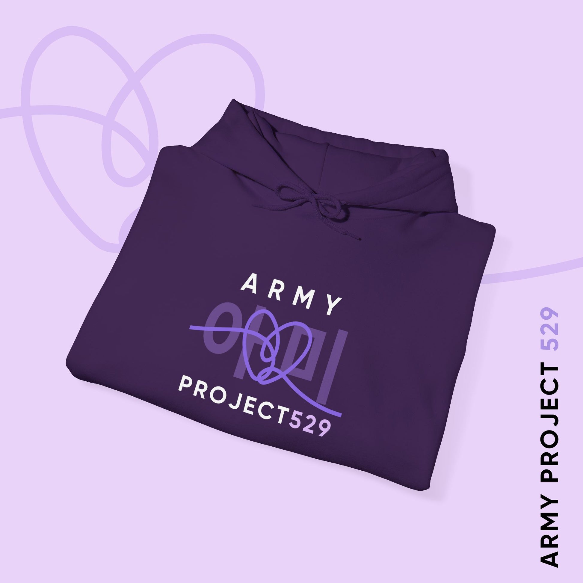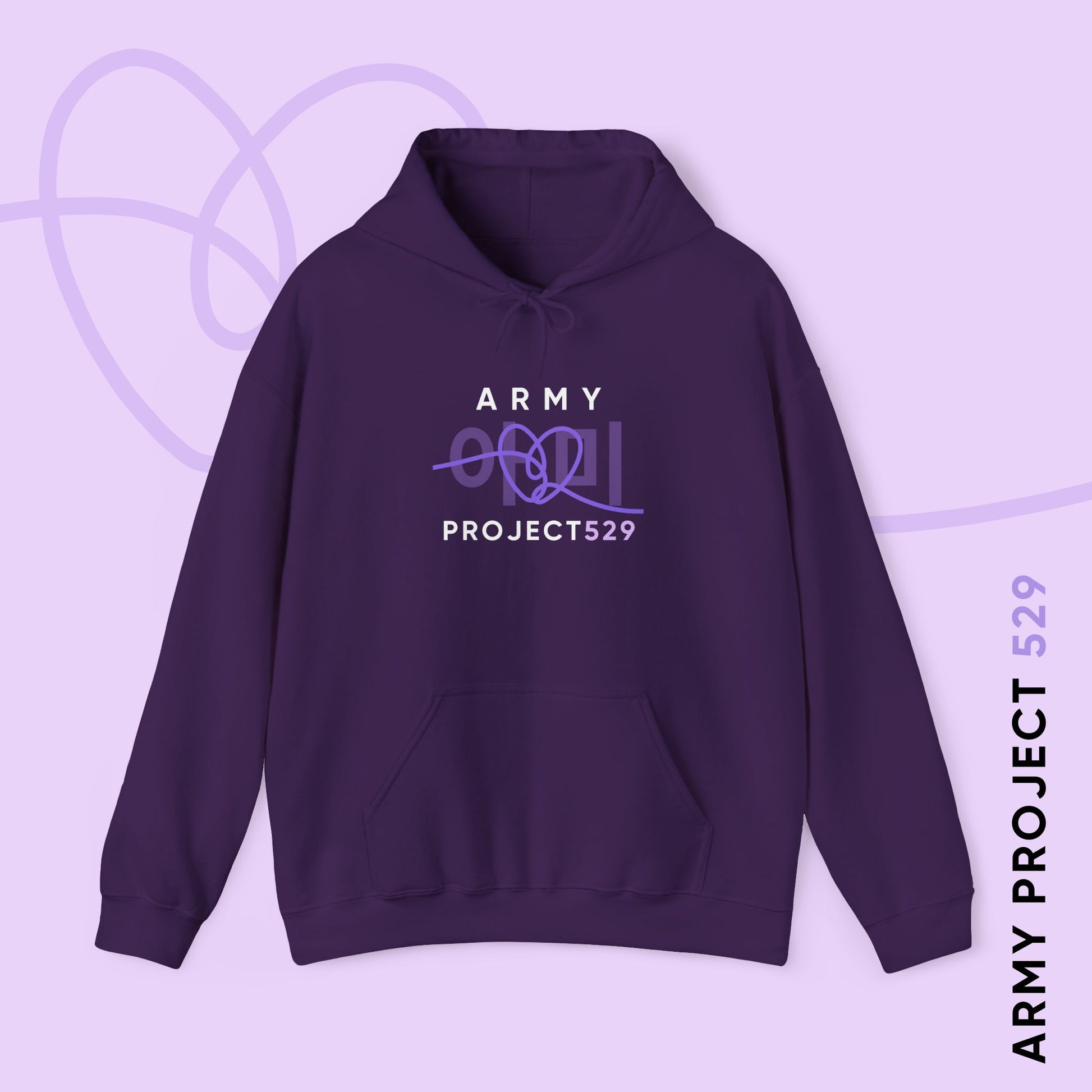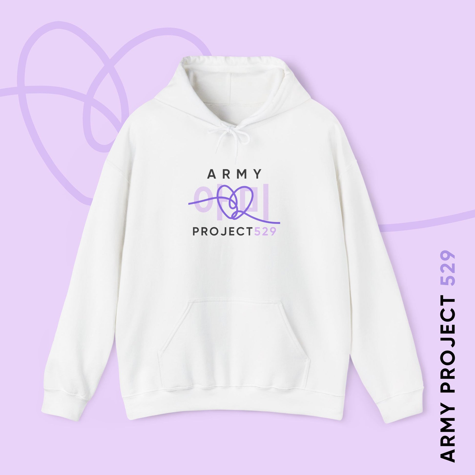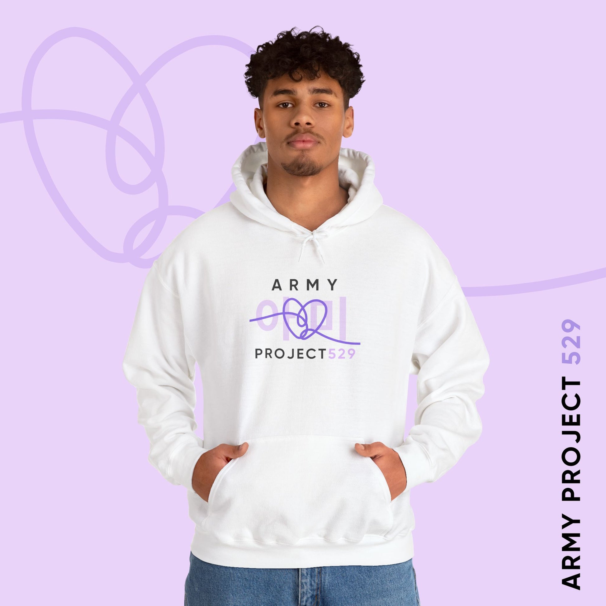 Stay warm and show your community pride with the ARMY Project 529 Hoodie! This comfortable pullover features our beloved logo: a heart with outstretched arms connecting us alongside the Hangul characters for ARMY. We started this wonderful project to keep each other company during BTS's enlistment, and two years later, we are still a strong, global BTS ARMY community of friends! This hoodie is the perfect piece of subtle fanmade BTS merch to let others know you’re part of this family.