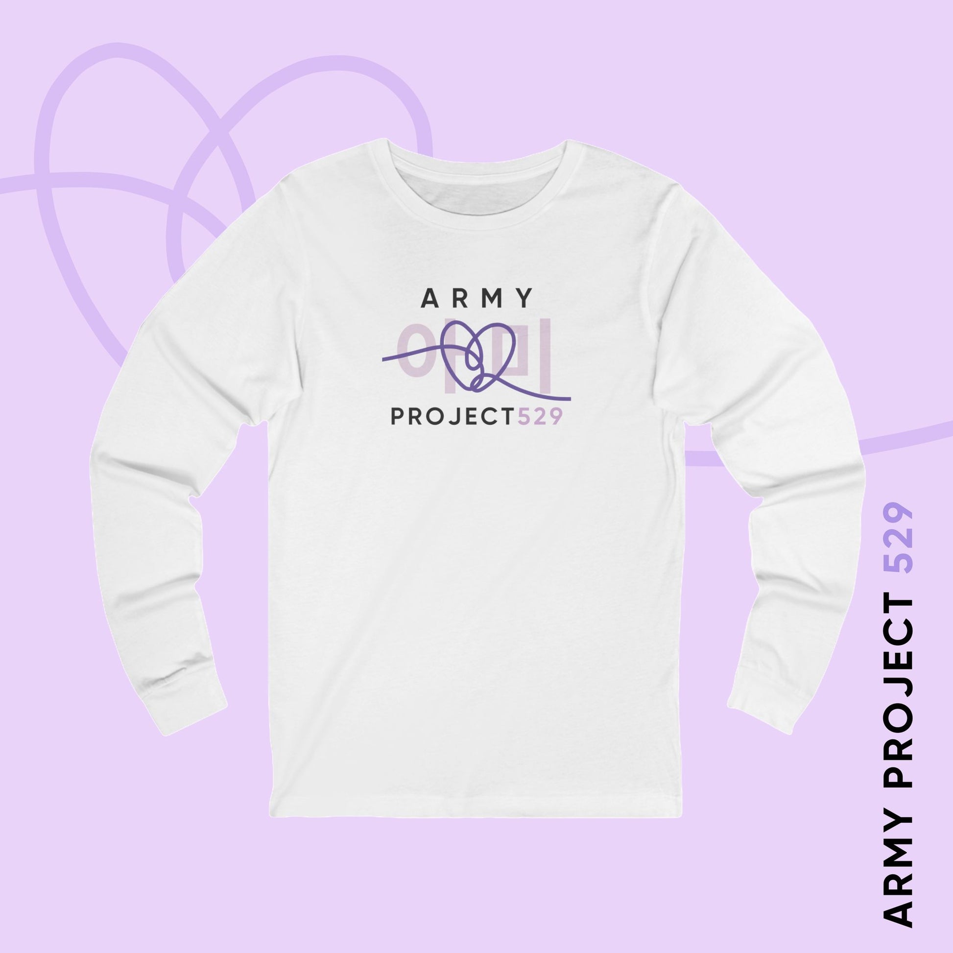 Stay comfortable while showing your community pride with the ARMY Project 529 Long Sleeve Tee! This classic long sleeve t-shirt features our community logo—a heart with outstretched arms, connecting us as friends around the globe, and the Hangul characters for 'ARMY'. This high-quality ARMY long sleeve shirt is a warm reminder of the bond we share, a community that began during the BTS enlistment period and continues to grow strong two years later.