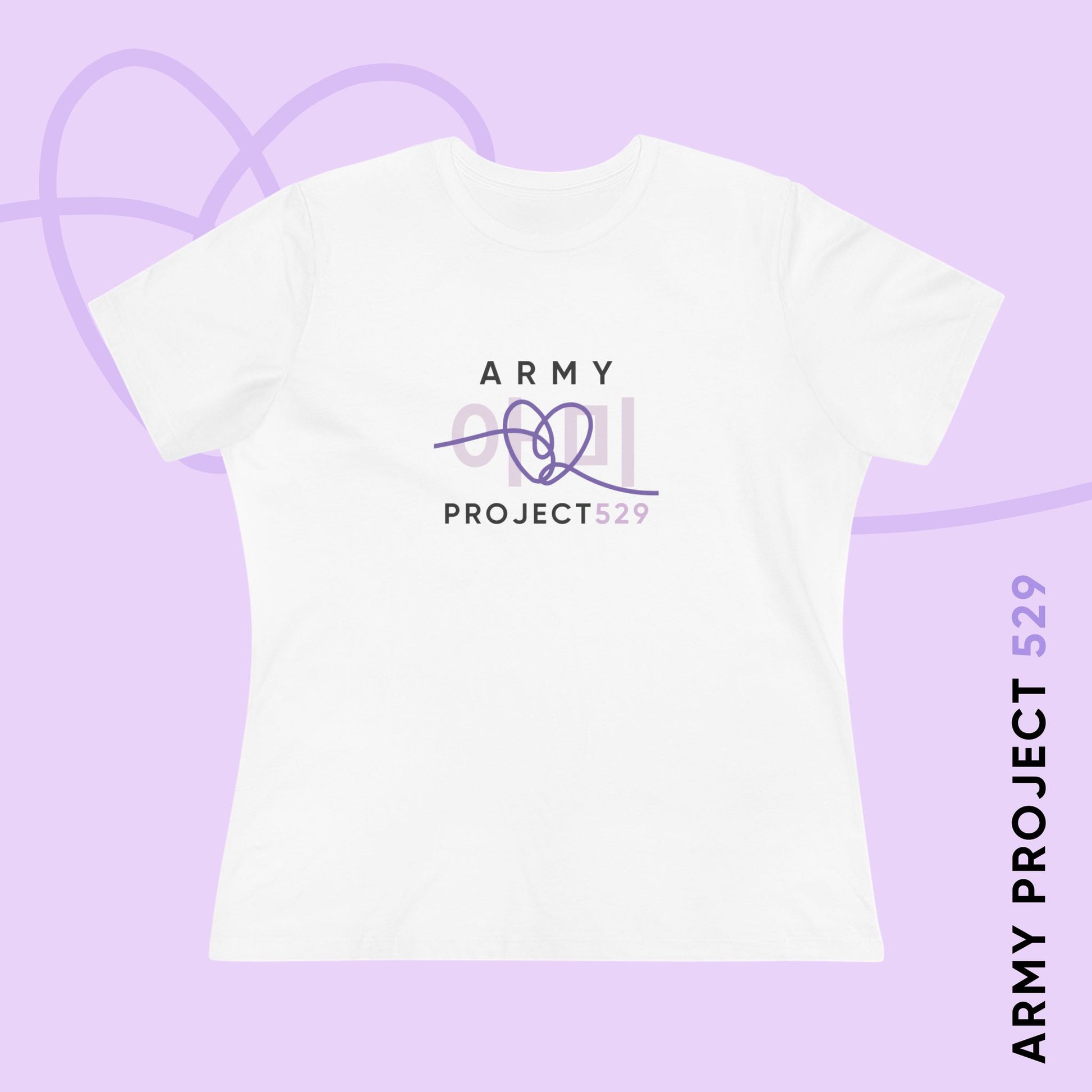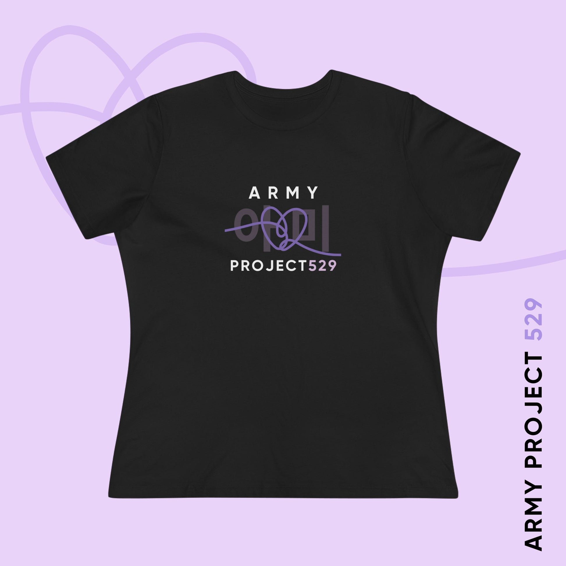Show off your pride for our incredible community with the ARMY Project 529 Women's Tee! This beautiful and meaningful tee features the official logo of the ARMY Project 529 fan community: a lovely heart with outstretched arms connecting us, woven together with the Hangul characters for ARMY. We started this journey with the goal of keeping each other company during BTS' enlistment, and two years later, we are still a wonderful global community of friends.