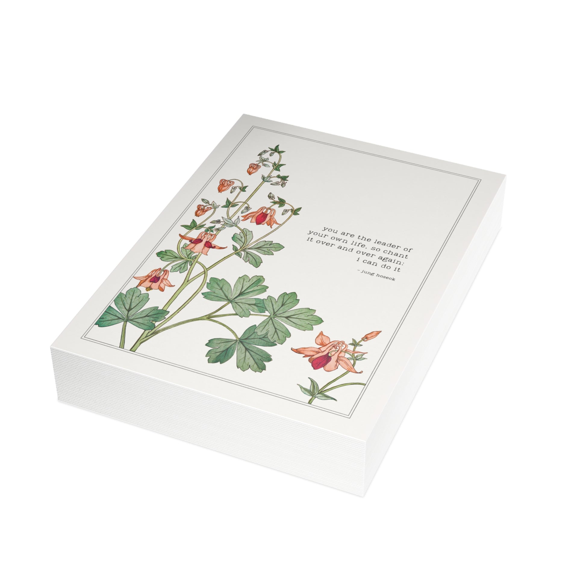 Ready to send a powerful reminder of self-belief? This beautiful BTS Greeting Card features a bright, inspirational quote from j-hope (Hobi): "You are the leader of your own life, so chant it over and over again: I can do it." This message perfectly captures Hobi's contagious optimism and powerful faith in ARMY, making it the ultimate ARMY Encouragement Gift for any friend facing a new project, starting a new job, or overcoming a major hurdle.