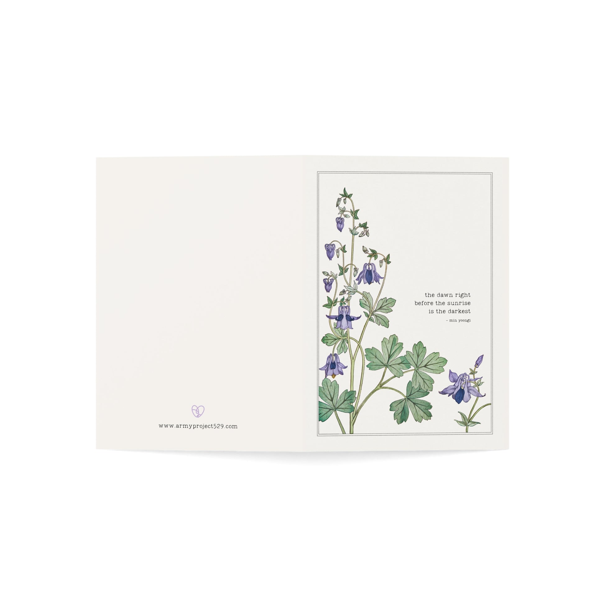Send a powerful message of hope to a fellow ARMY who needs it most with this beautiful Yoongi Greeting Card! This unique BTS Greeting Card is a thoughtful, fan-designed piece of BTS Stationery featuring the profound encouragement quote shared by SUGA: "The dawn right before the sunrise is the darkest." This sentiment is the perfect ARMY gift for anyone enduring a difficult time, reminding them that their struggle is temporary and success is right around the corner. The card's design features gorgeous vintage floral artwork that beautifully contrasts with the deep wisdom of the quote. It serves as a subtle yet powerful signal to any ARMY friend that you are quietly sending support and solidarity.