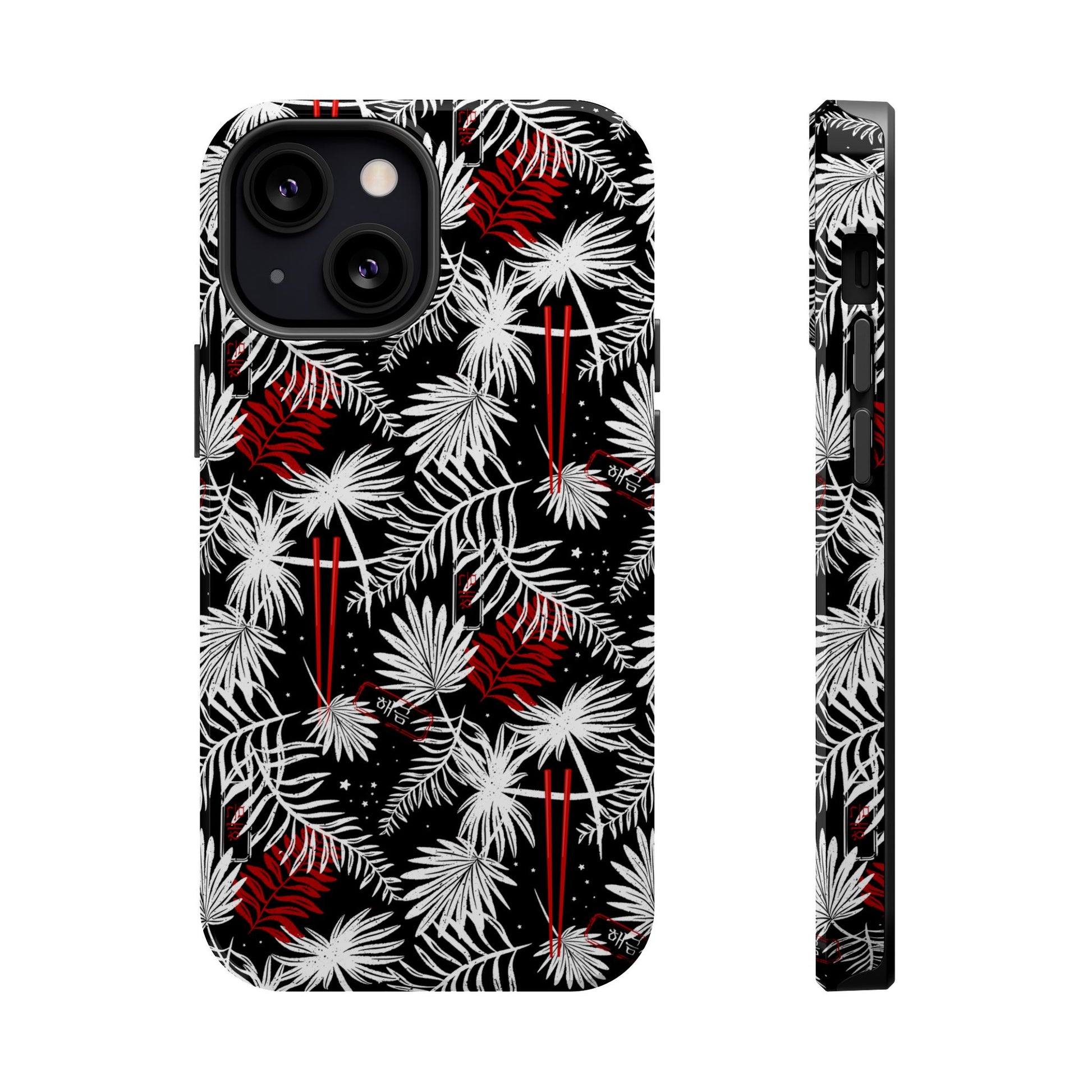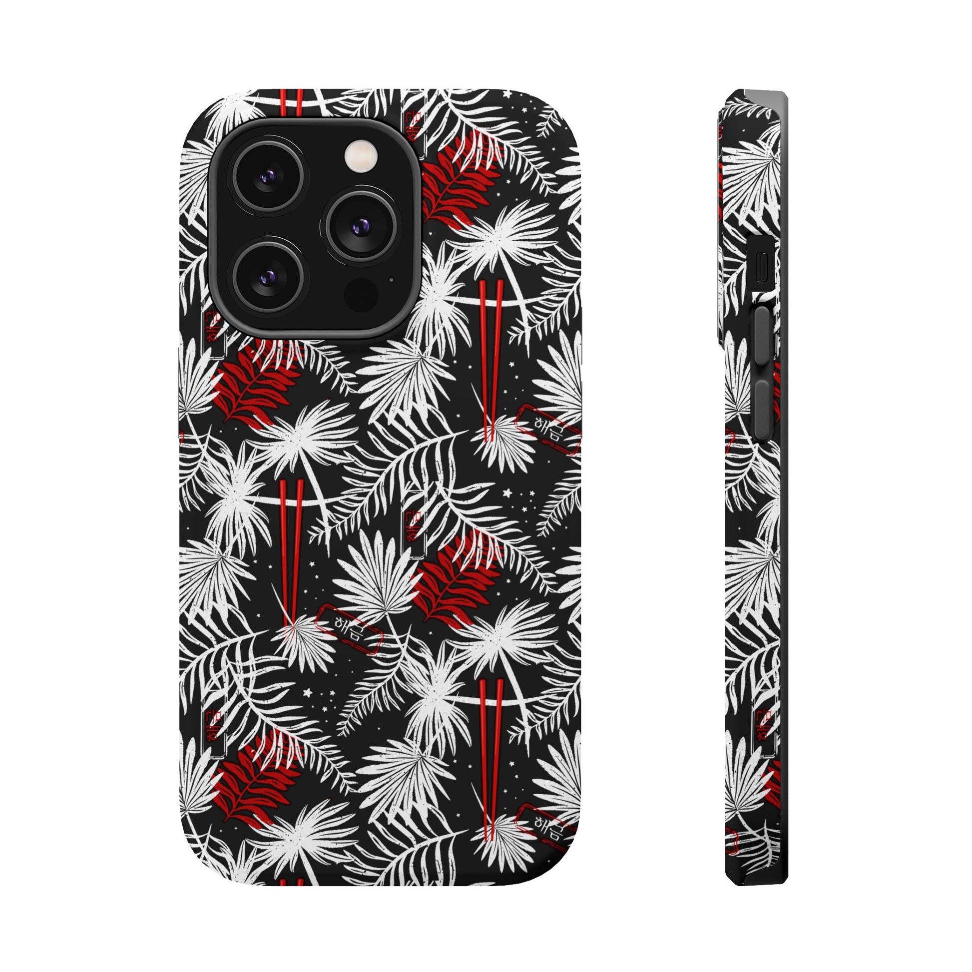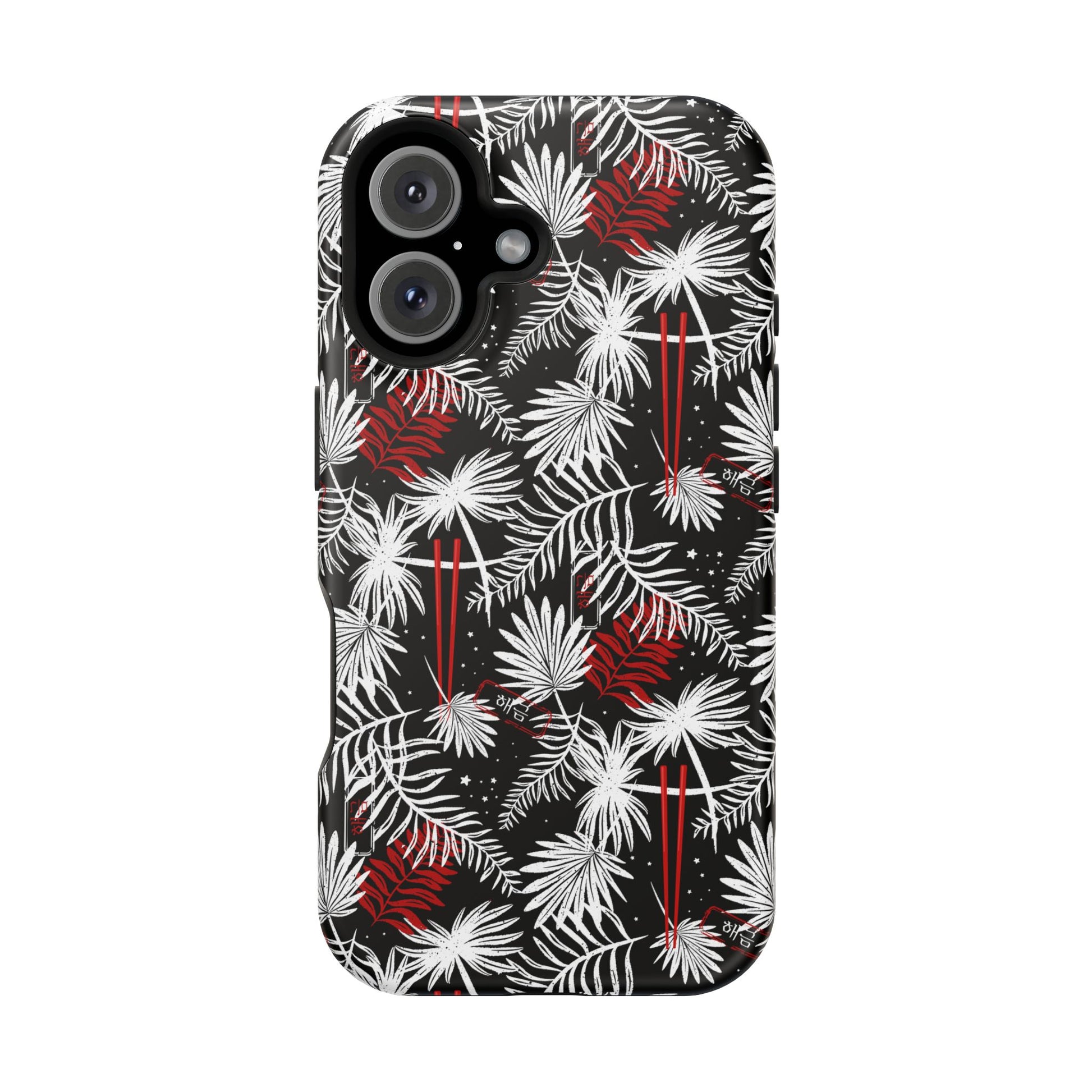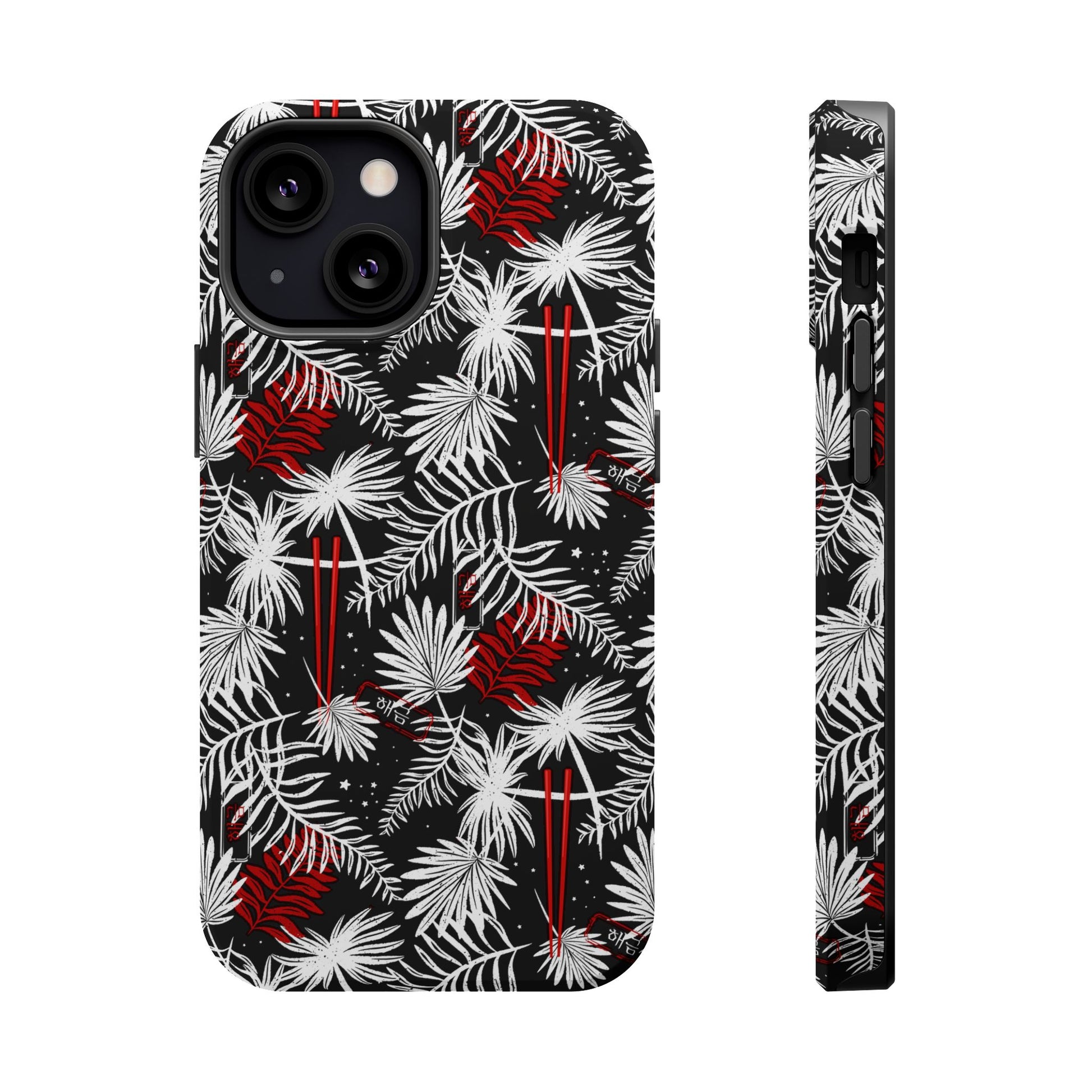 Spice up your device with our Tropical Chopsticks Tough Magnetic Phone Case, the perfect blend of style and function. This fanmade Agust D phone case features an original pattern inspired by the "Haegeum" M/V. The design highlights tropical Hawaiian shirt motifs, showcasing florals and leaves in high-contrast black and white, highlighted by vibrant red chopsticks and scattered stars. Look closely and you’ll spot the unique detail of hidden Hangul.