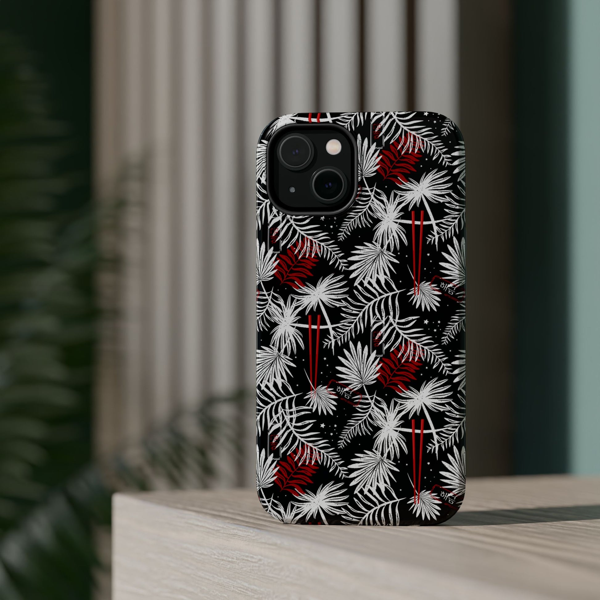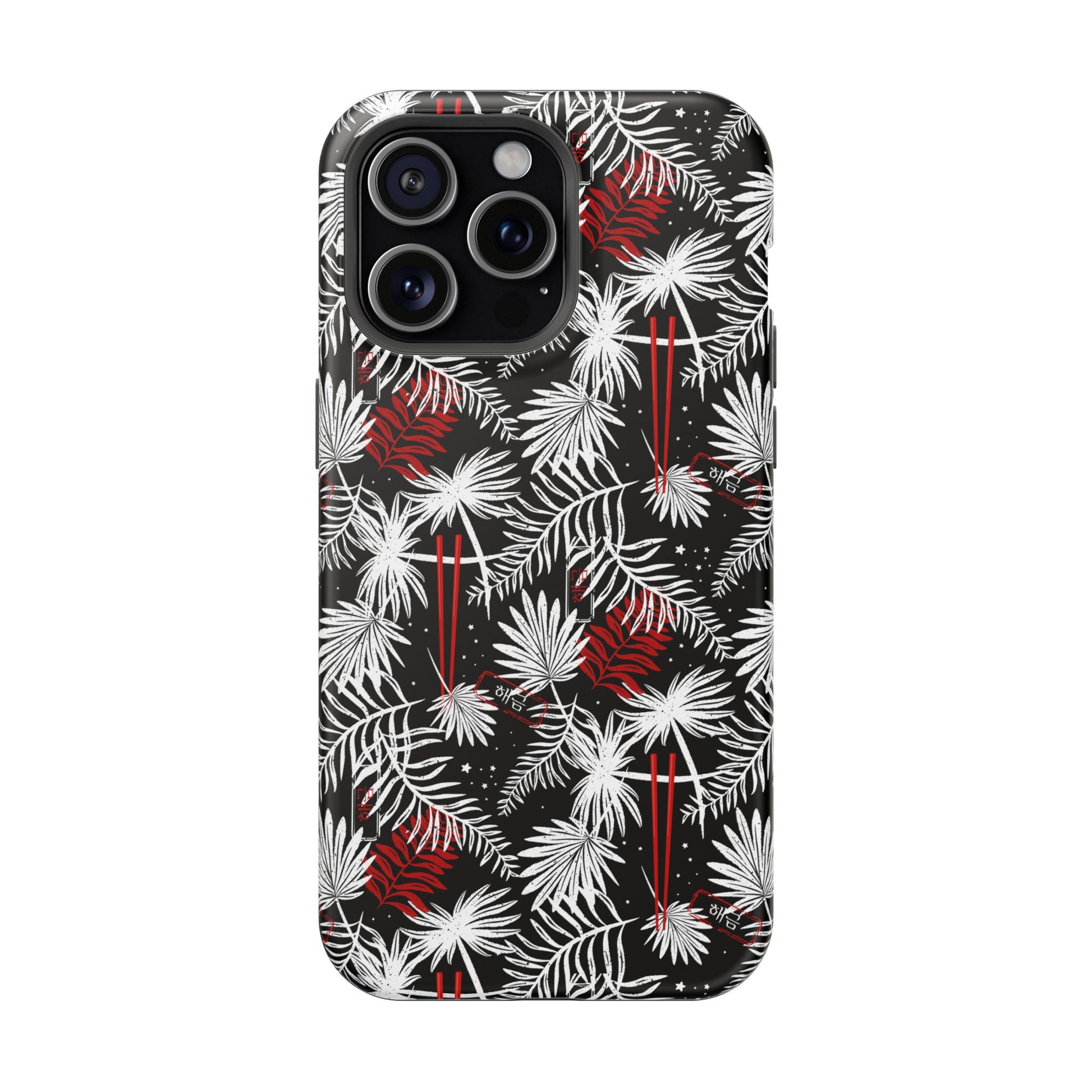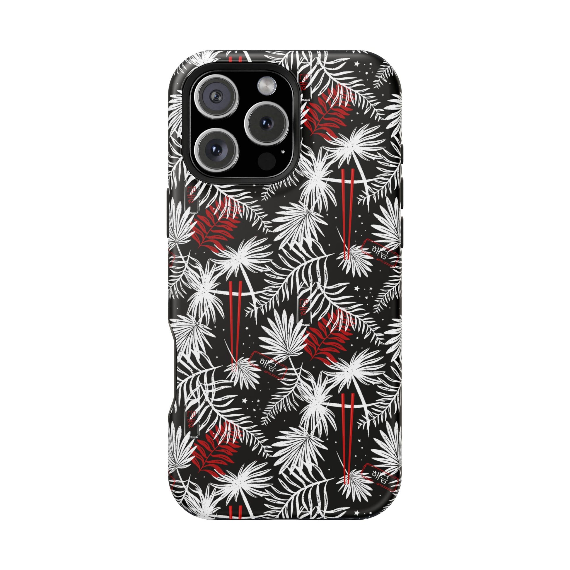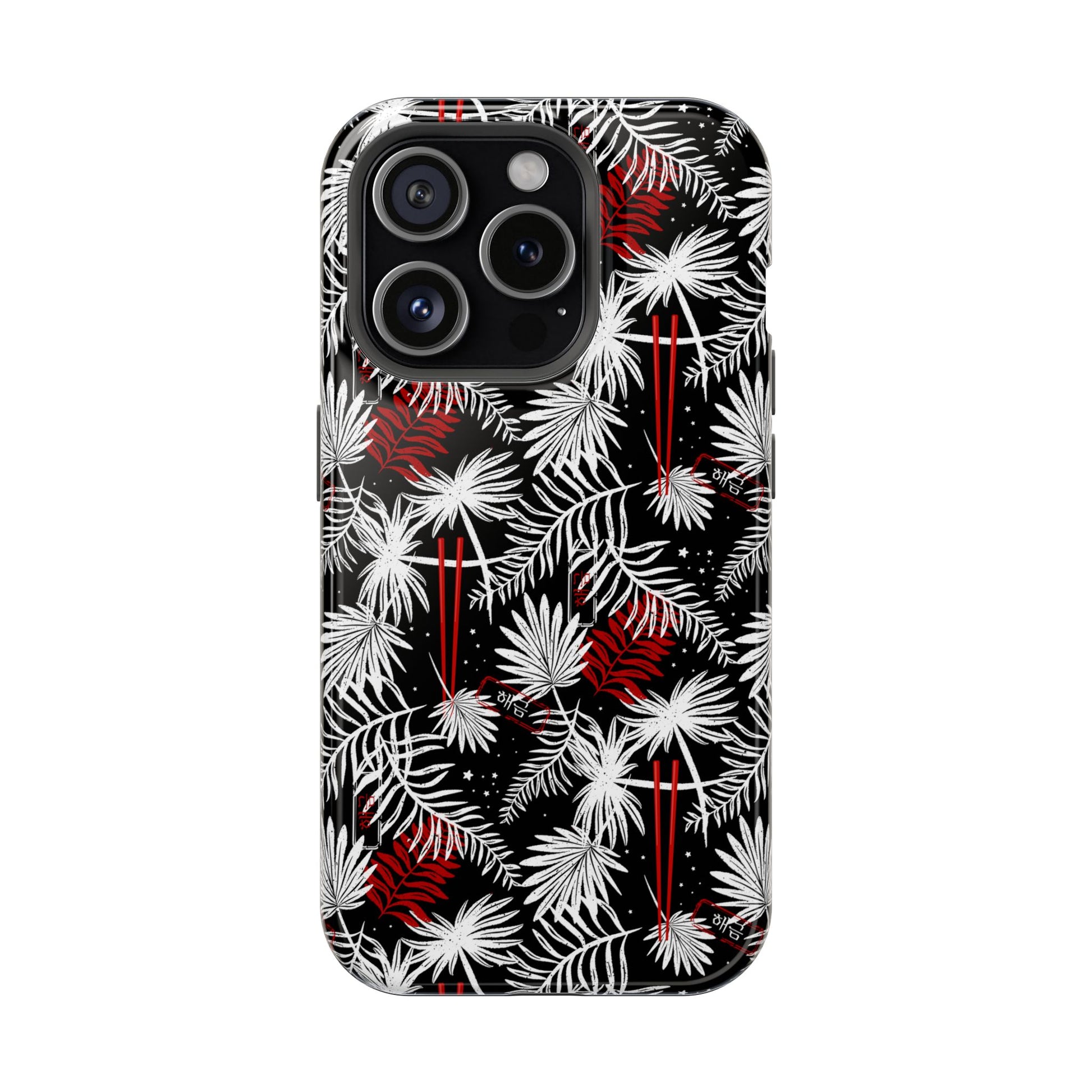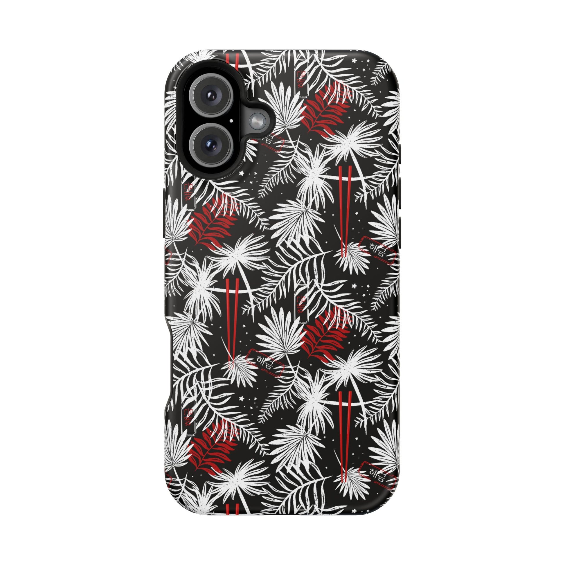 Spice up your device with our Tropical Chopsticks Tough Magnetic Phone Case, the perfect blend of style and function. This fanmade Agust D phone case features an original pattern inspired by the "Haegeum" M/V. The design highlights tropical Hawaiian shirt motifs, showcasing florals and leaves in high-contrast black and white, highlighted by vibrant red chopsticks and scattered stars. Look closely and you’ll spot the unique detail of hidden Hangul.