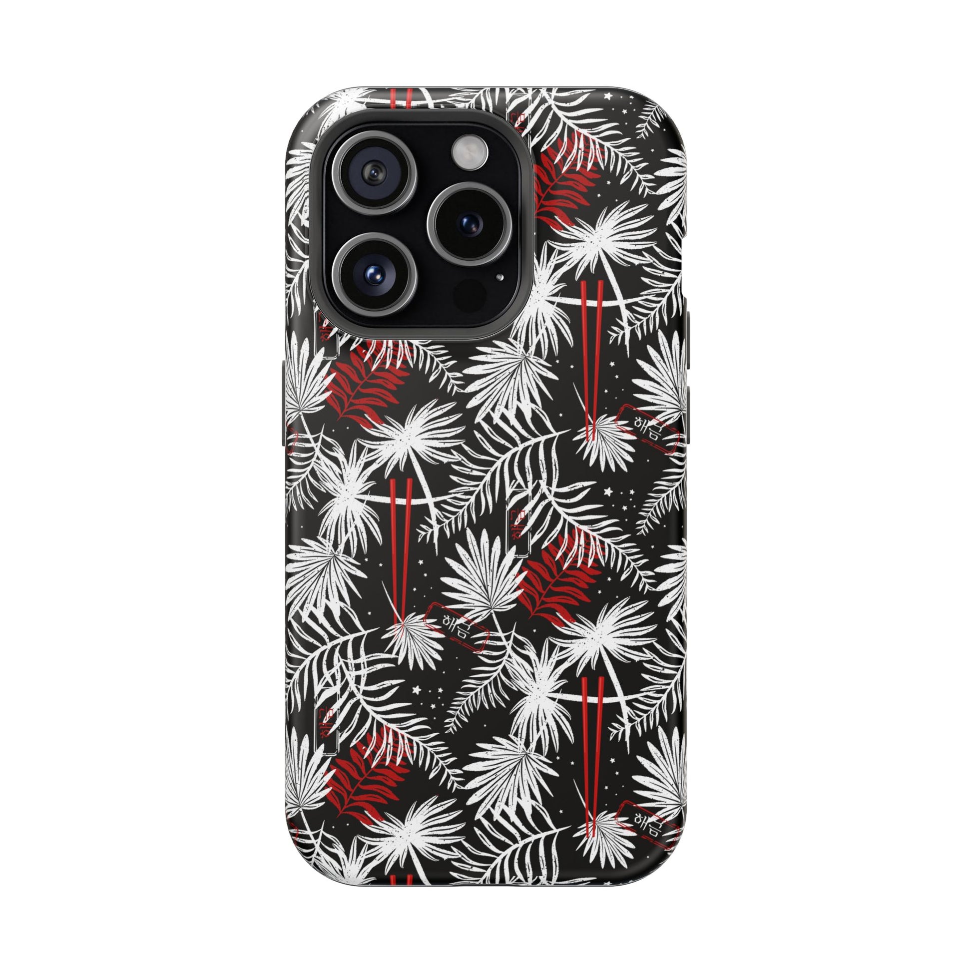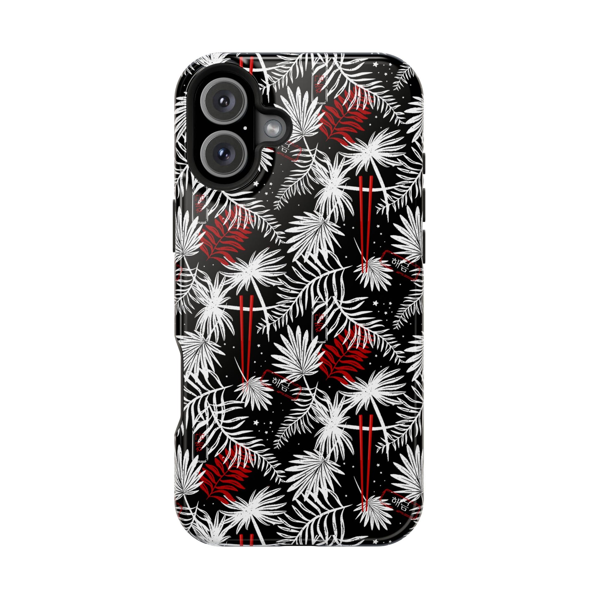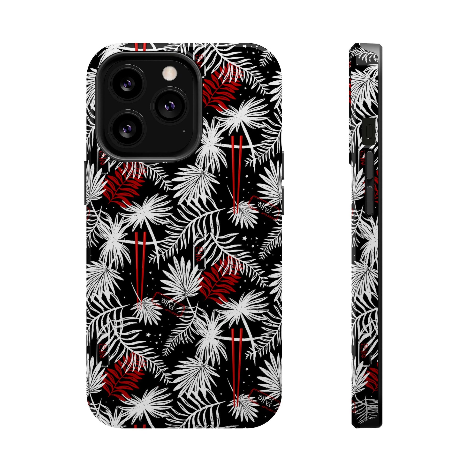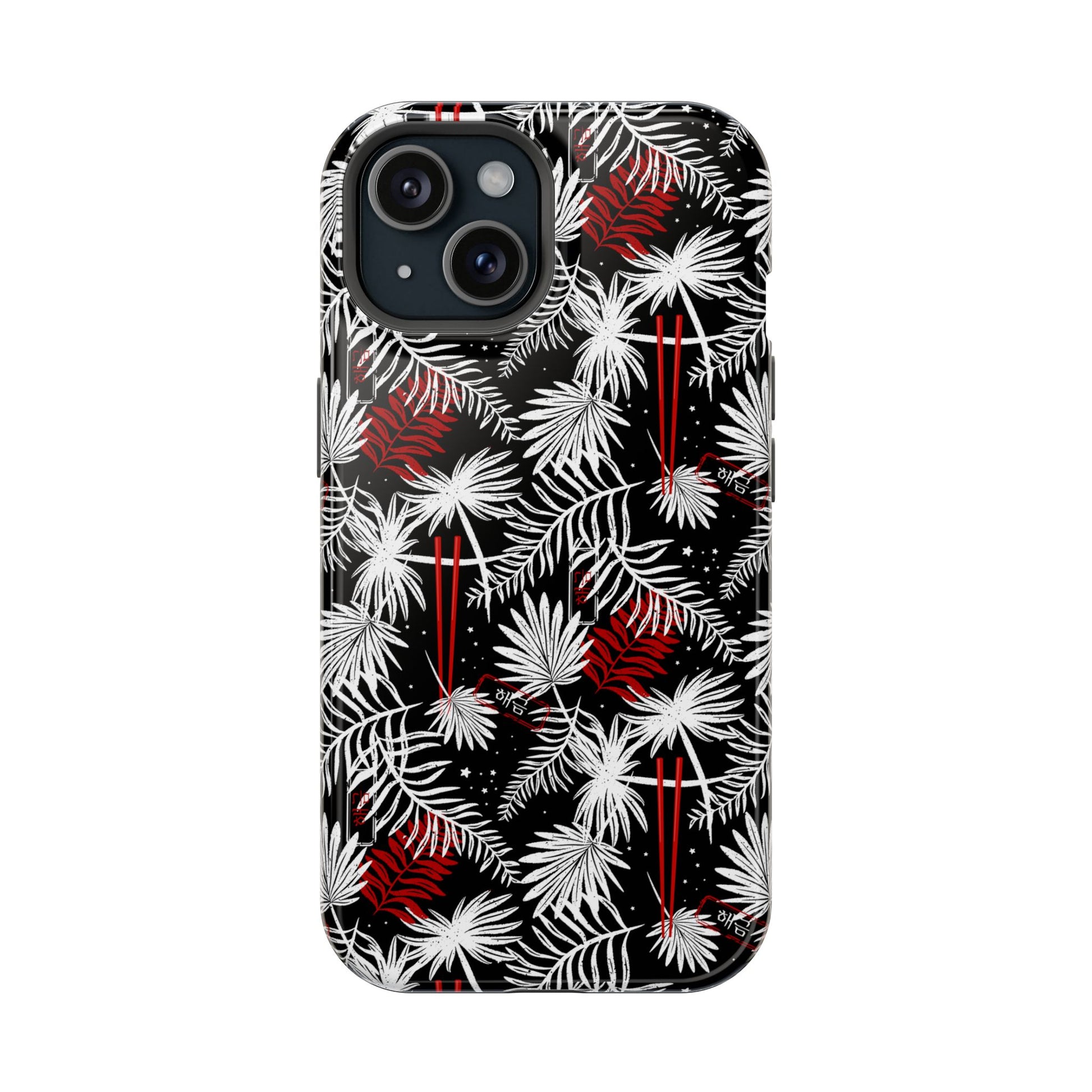 Spice up your device with our Tropical Chopsticks Tough Magnetic Phone Case, the perfect blend of style and function. This fanmade Agust D phone case features an original pattern inspired by the "Haegeum" M/V. The design highlights tropical Hawaiian shirt motifs, showcasing florals and leaves in high-contrast black and white, highlighted by vibrant red chopsticks and scattered stars. Look closely and you’ll spot the unique detail of hidden Hangul.