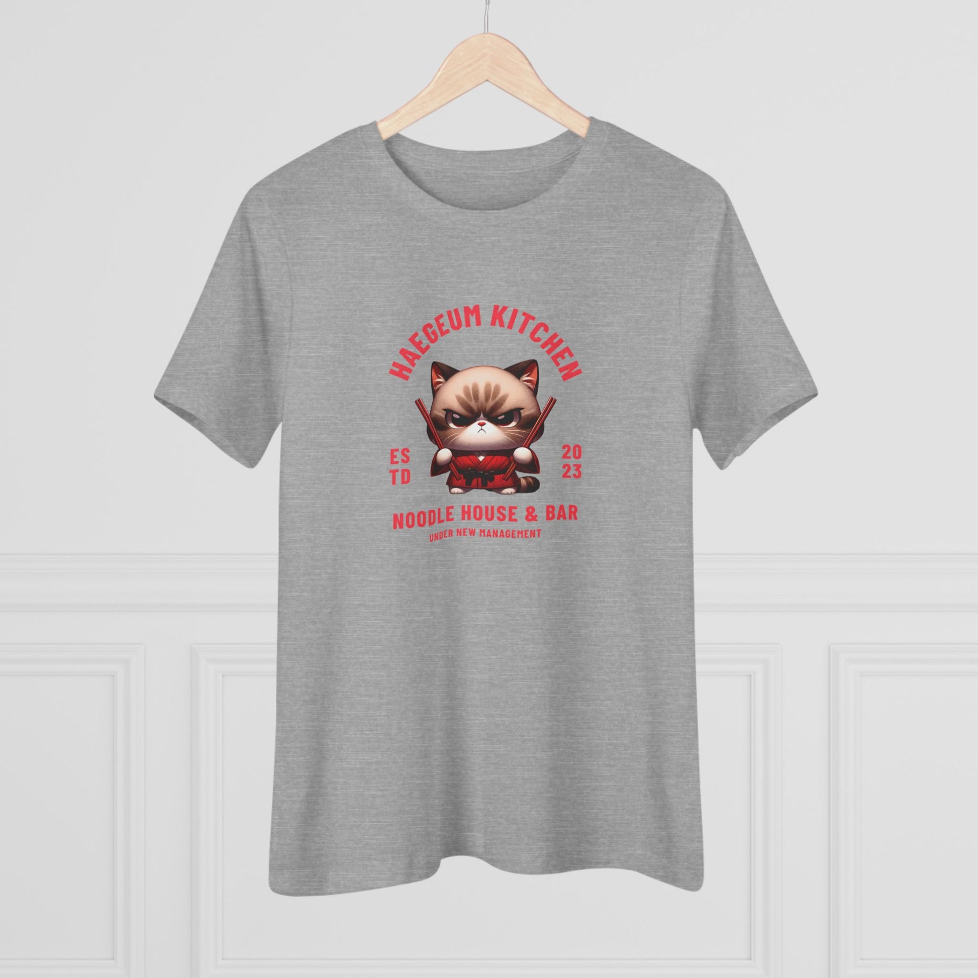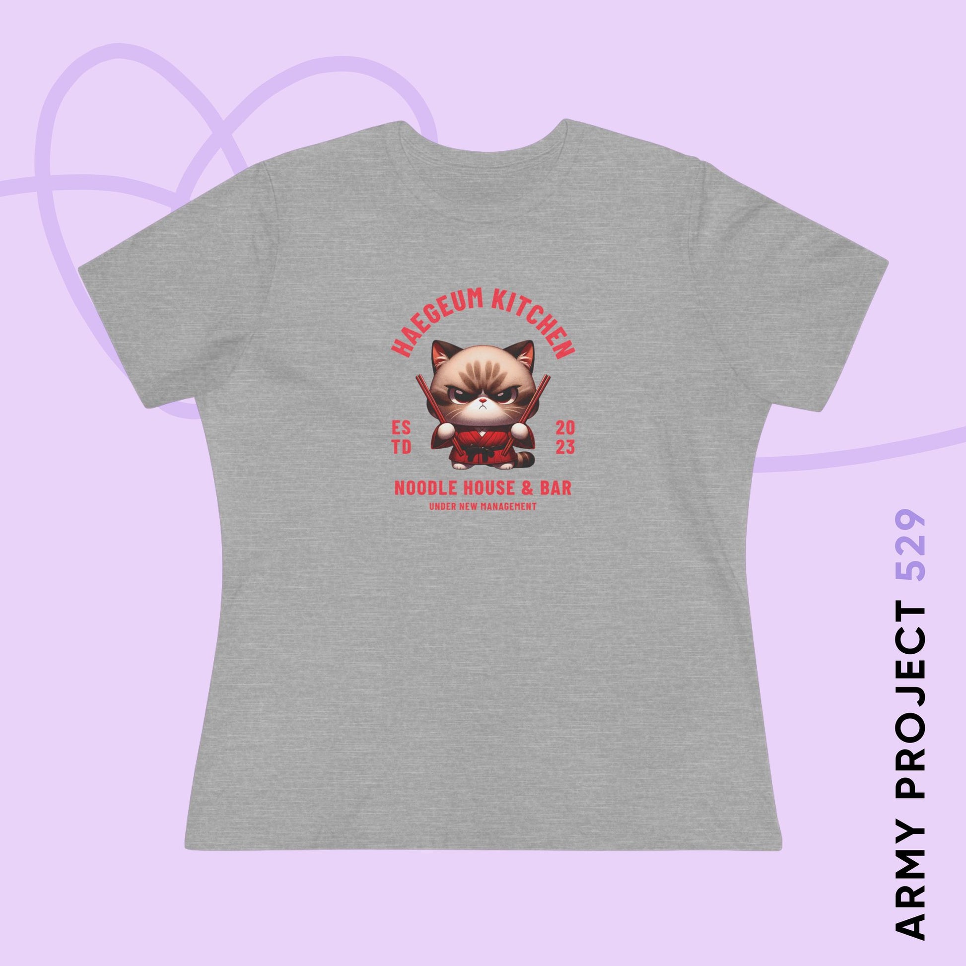 Serve up some style with our exclusive Haegeum Noodle House Women's Tee, a perfect piece of subtle fanmade BTS apparel for any ARMY! This clever original design features an adorably grumpy cartoon cat fiercely wielding red chopsticks—a playful nod to BTS member Yoongi's famously cat-like persona and his 2023 hit song, "Haegeum." The Haegeum Noodle House design offers a beautiful and discreet way to share your fandom, making it the ultimate addition to your collection of fanmade Yoongi apparel.