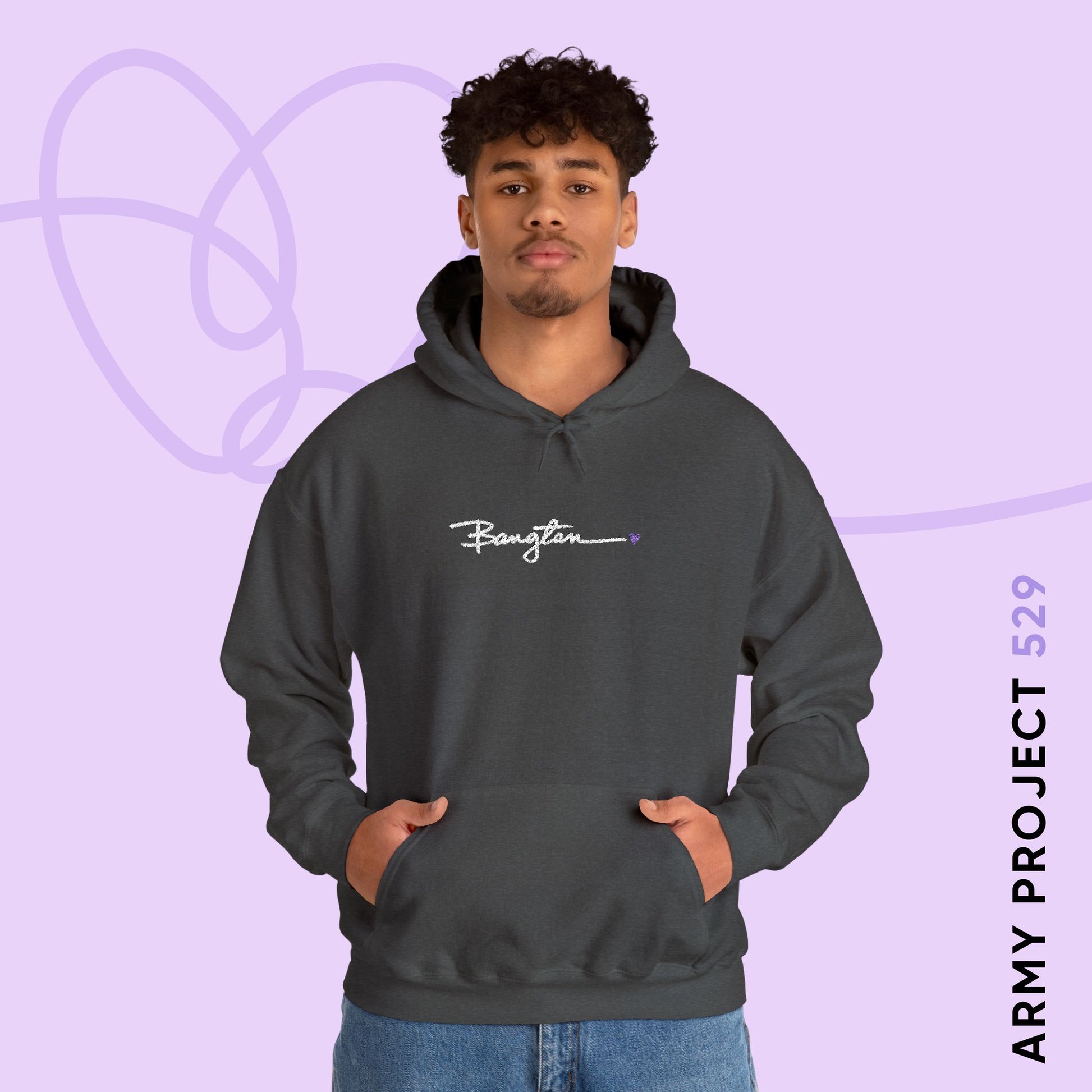 Cozy up in the Handwritten Bangtan Hoodie. This premium embroidered hoodie features the word "Bangtan" in Christina's lovely handwriting, complete with a tiny purple heart for a bit of borahae. It’s the perfect way to celebrate OT7 while maintaining a chic, minimalist style.