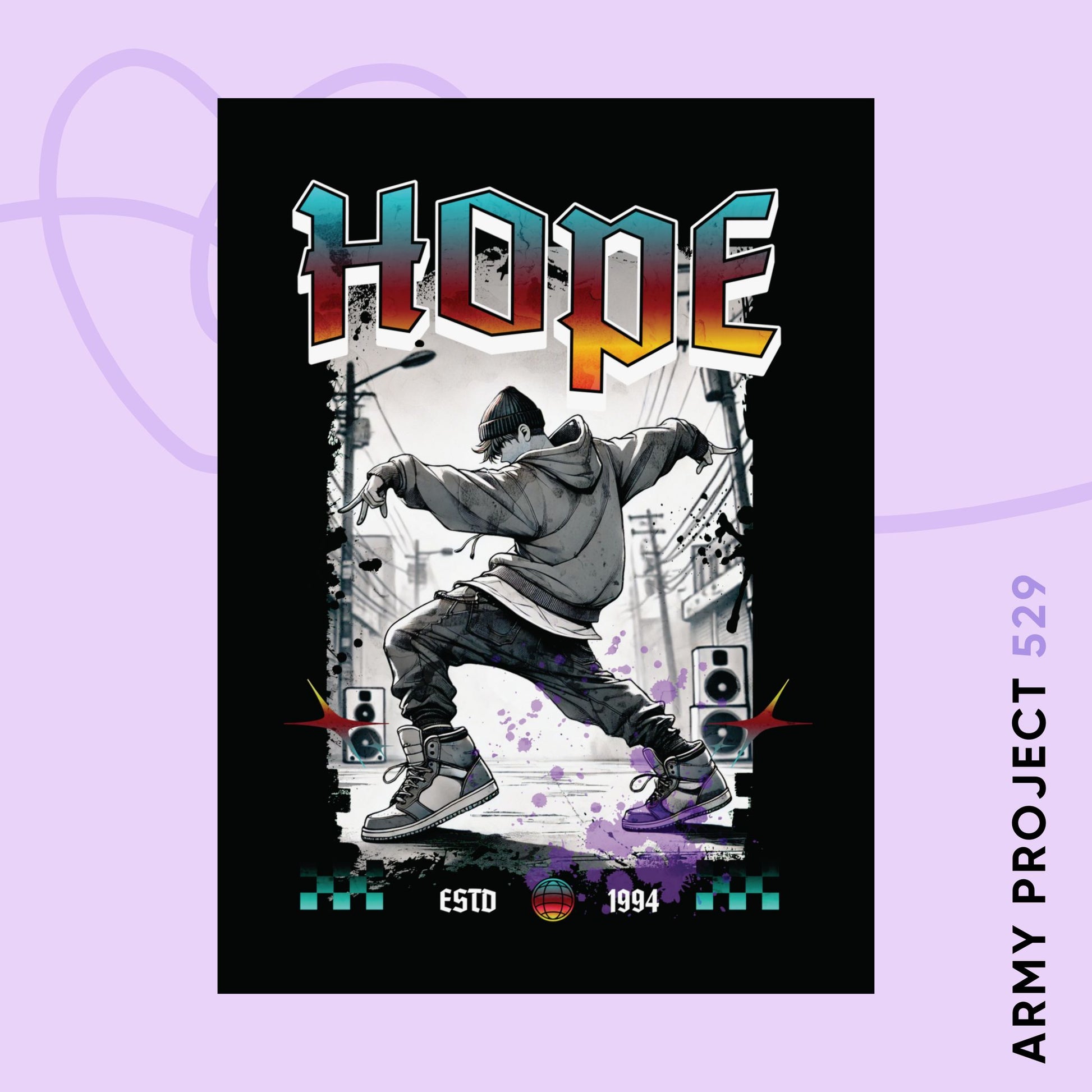 Bring the sunshine and foundational hip-hop spirit of Jung Hoseok right into your space with this stunning, exclusive Hobi 90s retro poster! This vibrant BTS j-hope wall art is a must-have piece of ARMY fanmade merchandise, designed by ARMY, for ARMY, to celebrate the iconic energy of our bias. Part of the fan-favorite ARMY Project 529 Retro Series, this artwork is a beautiful homage to j-hope's roots in the street dance scene, making it perfect for your j-hope bias décor.