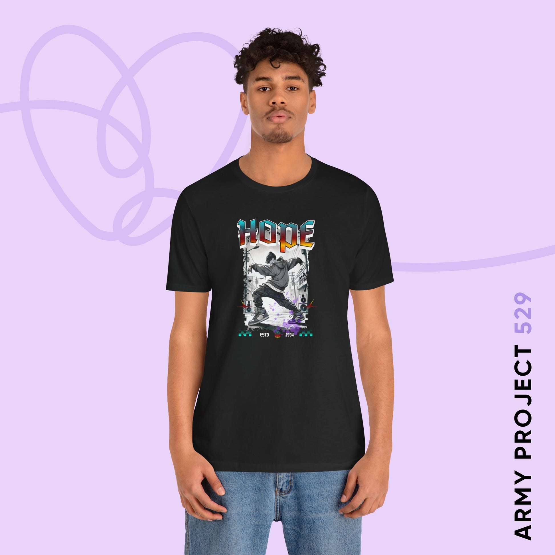 Embrace the vibrant energy of j-hope (Hobi) and the iconic 90s hip-hop aesthetic that influences his artistry! This exclusive unisex Kpop apparel features a bold, in-house design that pays homage to j-hope’s love for bright colors, street dancing, and classic graffiti style.