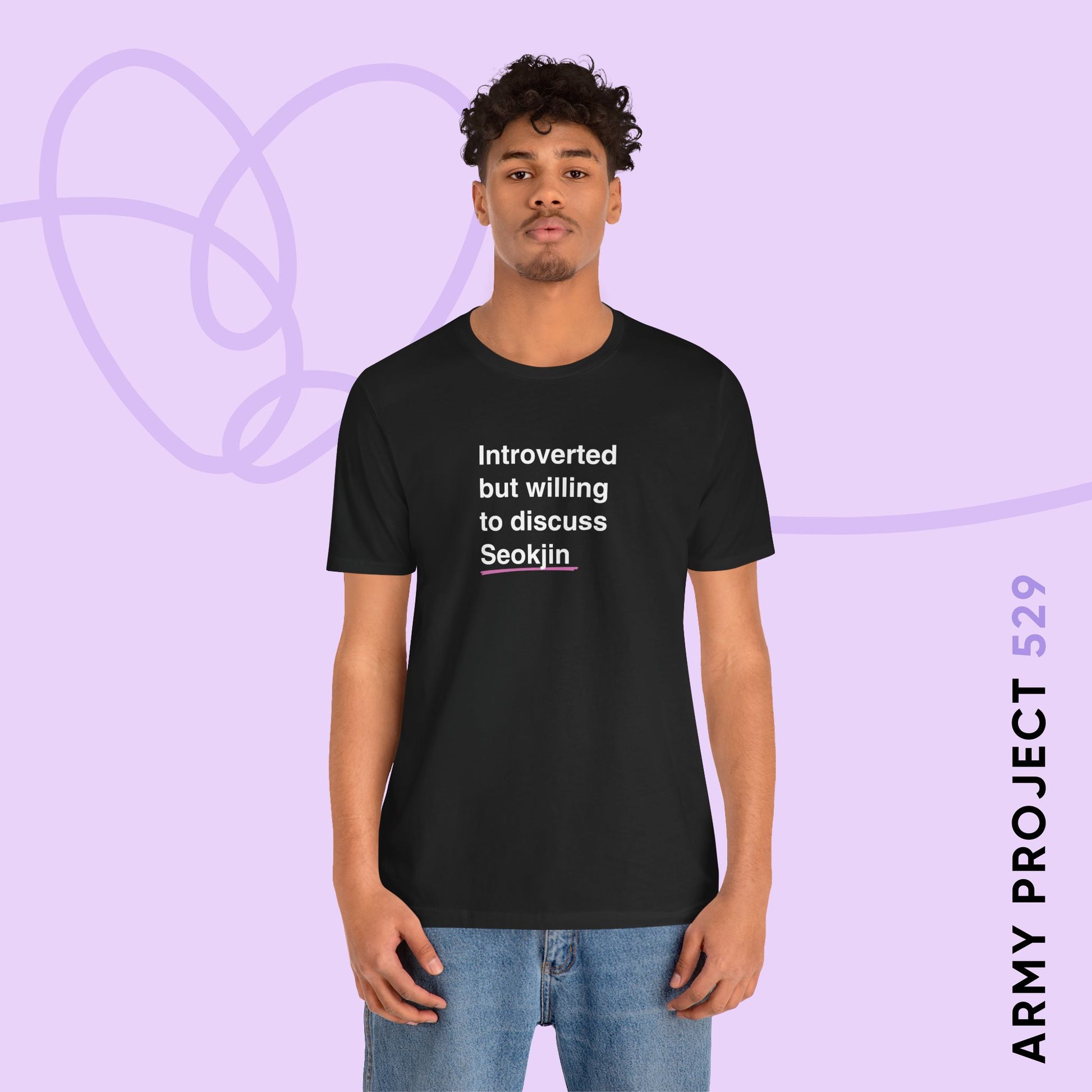 Subtly display your bias with this charming design featuring the playful message, "Introverted But Willing to Discuss Seokjin". Perfect for those who prefer to keep a low profile, but can't resist a good conversation about seven normal boys from Korea.