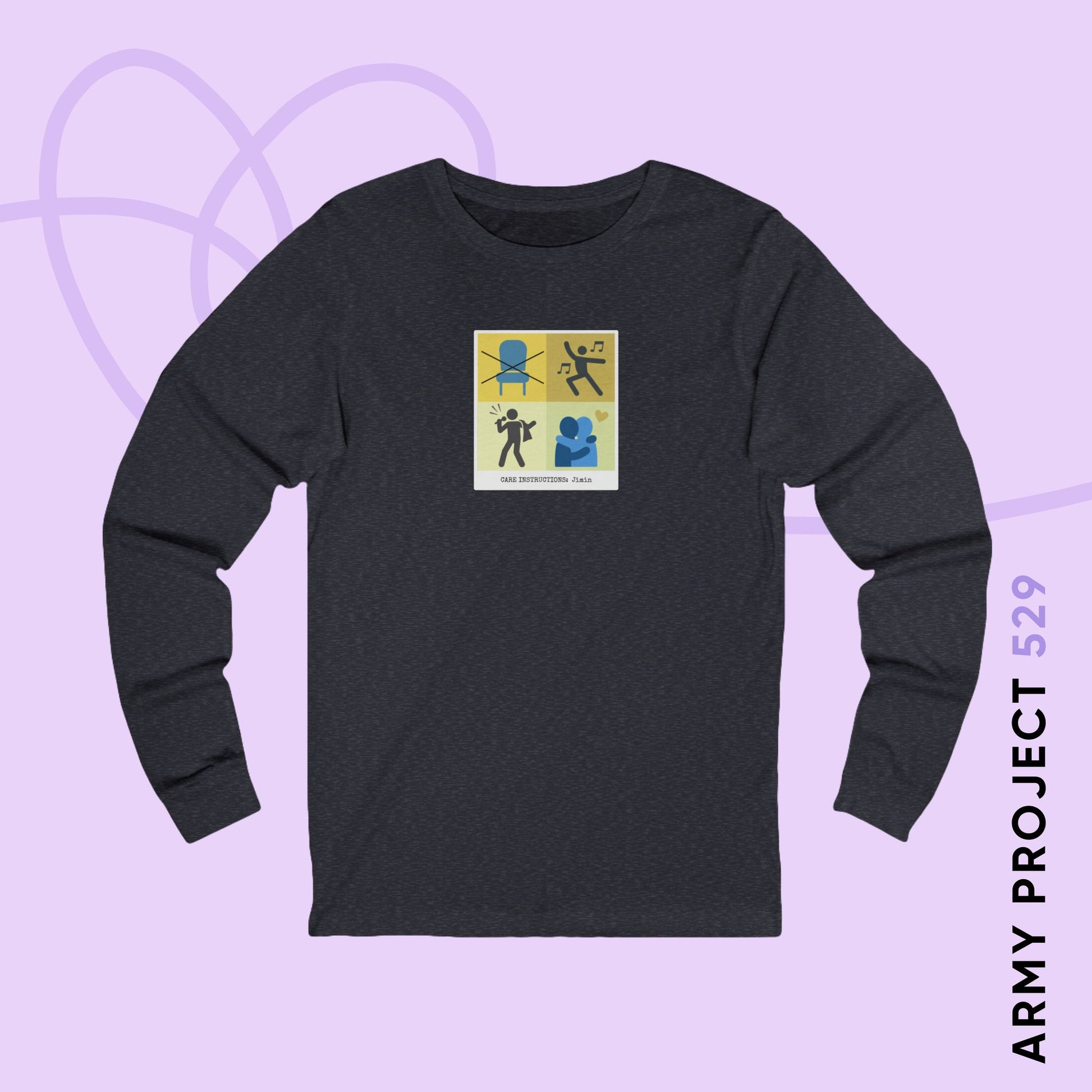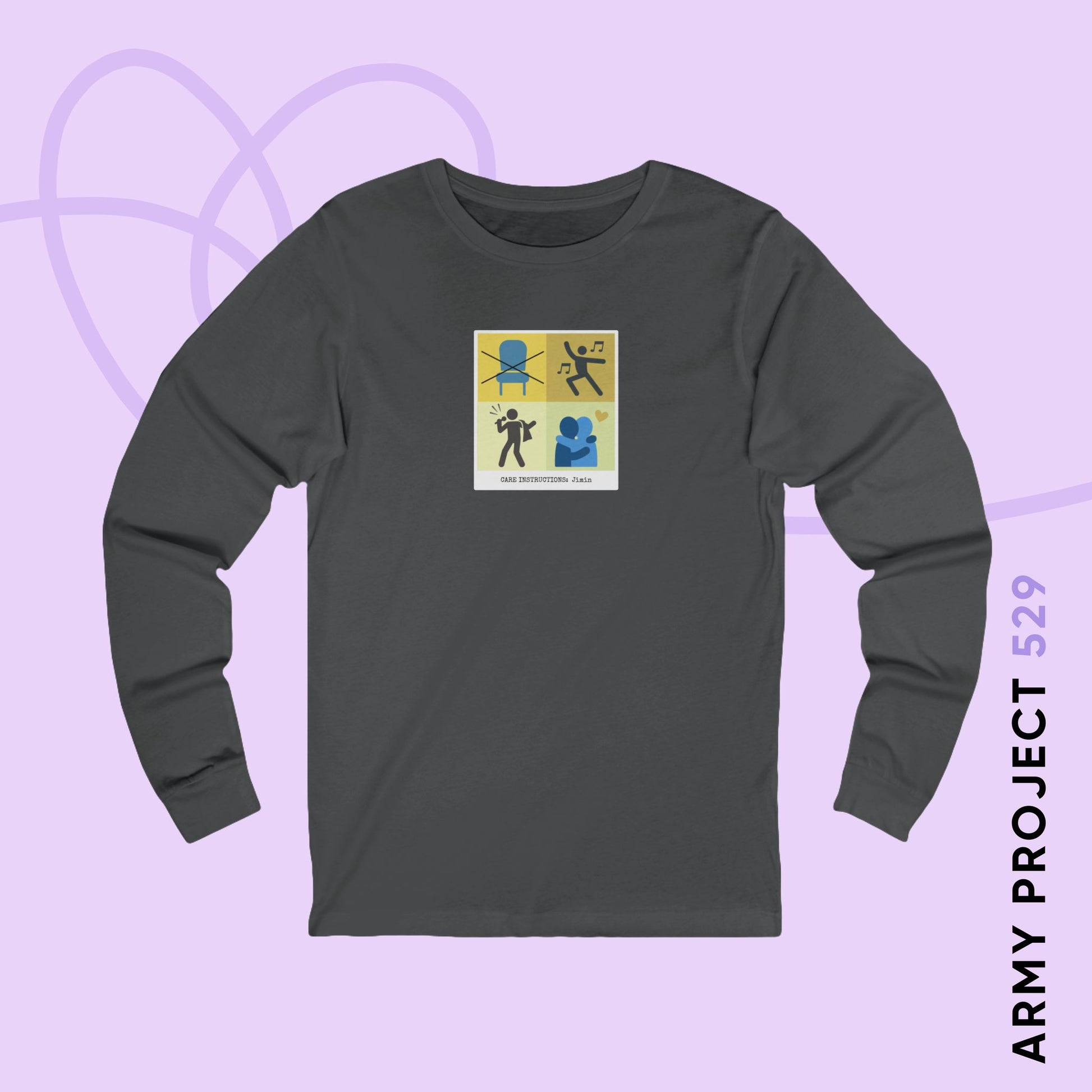 Looking for a piece of subtle fanmade BTS merch to keep cozy? This clever Jimin Care Instructions Long Sleeve Tee is a great addition any ARMY's wardrobe. Playing on standard clothing care tags, this witty shirt provides hilarious, personalized "care instructions" for Jimin, suggesting you must always give him outerwear to elegantly shrug off his shoulder while dancing, while including the critical warning to keep all chairs far, far away! This witty BTS fan apparel is the ultimate inside-joke tee, designed by ARMY for ARMY, making it a perfect piece of fanmade Jimin merch for yourself or a friend.