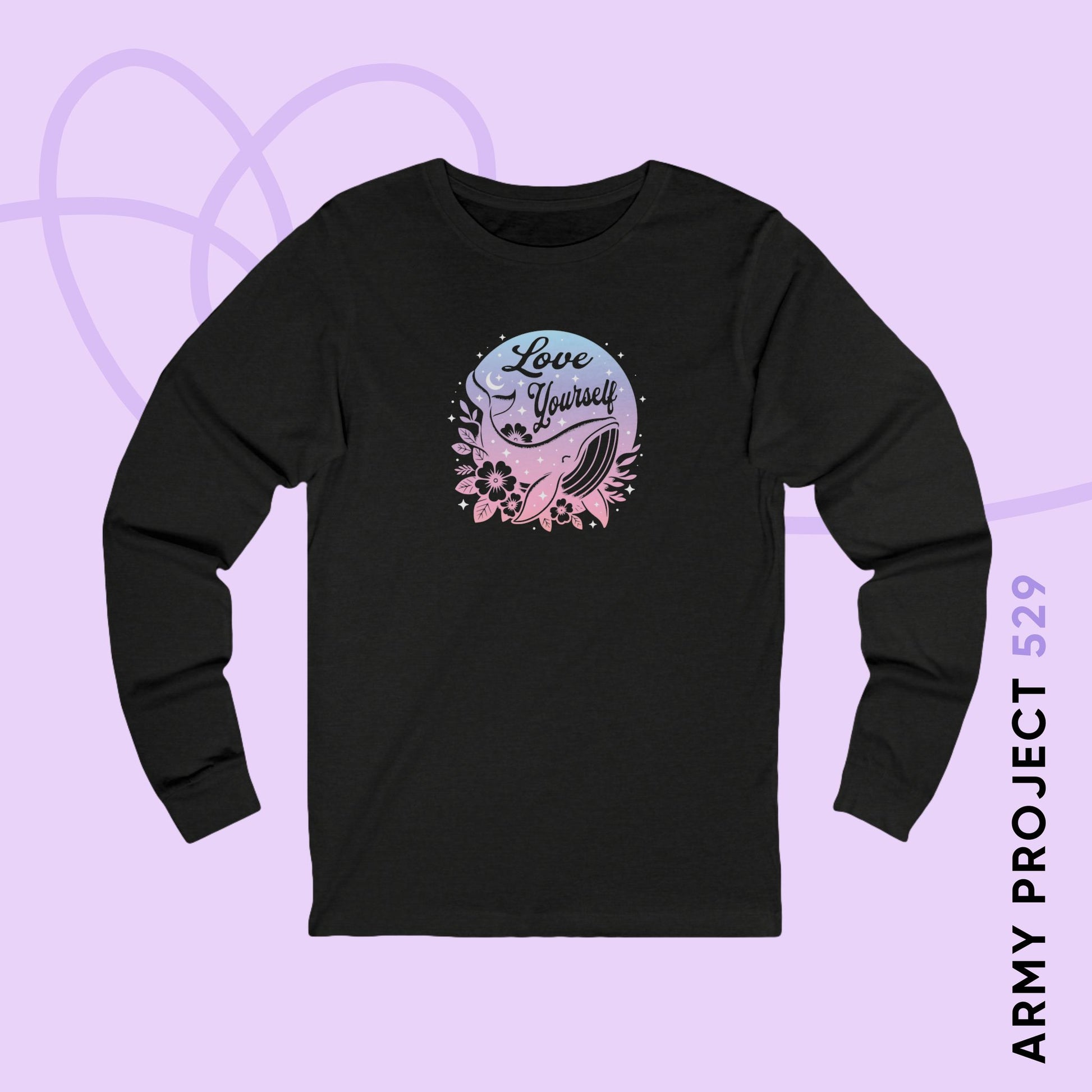 Slip into comfort with the Love Yourself Long Sleeve Tee, a gorgeous piece of fanmade BTS apparel that beautifully captures Bangtan's message of self-acceptance. This premium graphic tee features a whimsical, pastel gradient design incorporating beloved BTS motifs like the whale, shimmering stars, and delicate flowers, subtly nodding to the group's most iconic lyrics and music videos. Designed by an ARMY, for ARMY, this subtle fanmade BTS t-shirt is perfect for everyday wear, letting you carry a piece of your fandom while celebrating the powerful Love Yourself message that defines the ARMY spirit.