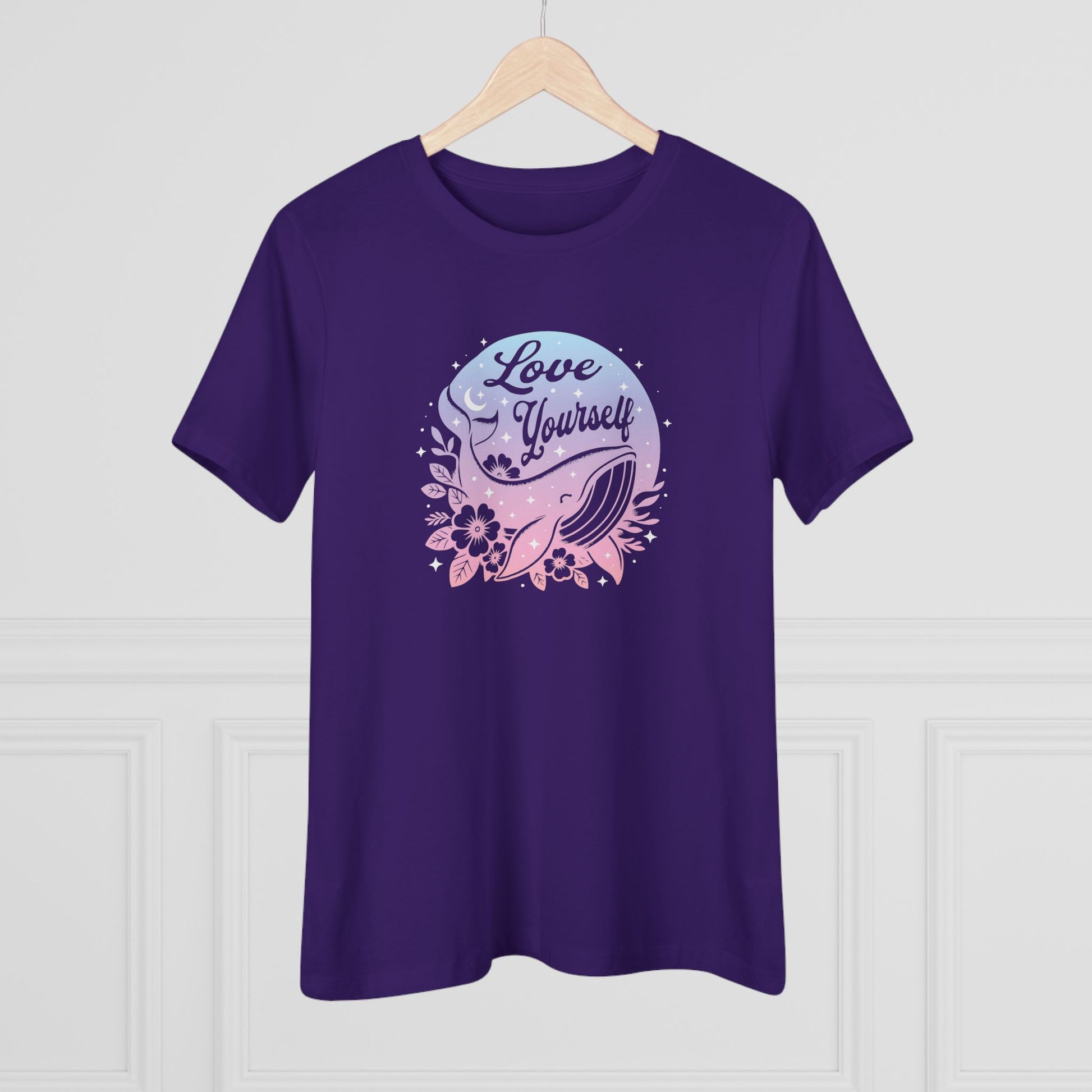 Slip into comfort with the Love Yourself Women's Tee, a gorgeous piece of fanmade BTS apparel that beautifully captures Bangtan's message of self-acceptance. This premium graphic tee features a whimsical, pastel gradient design incorporating beloved BTS motifs like the whale, shimmering stars, and delicate flowers, subtly nodding to the group's most iconic lyrics and music videos. Designed by an ARMY, for ARMY, this subtle fanmade BTS t-shirt is perfect for everyday wear, letting you carry a piece of your fandom while celebrating the powerful Love Yourself message that defines the ARMY spirit.