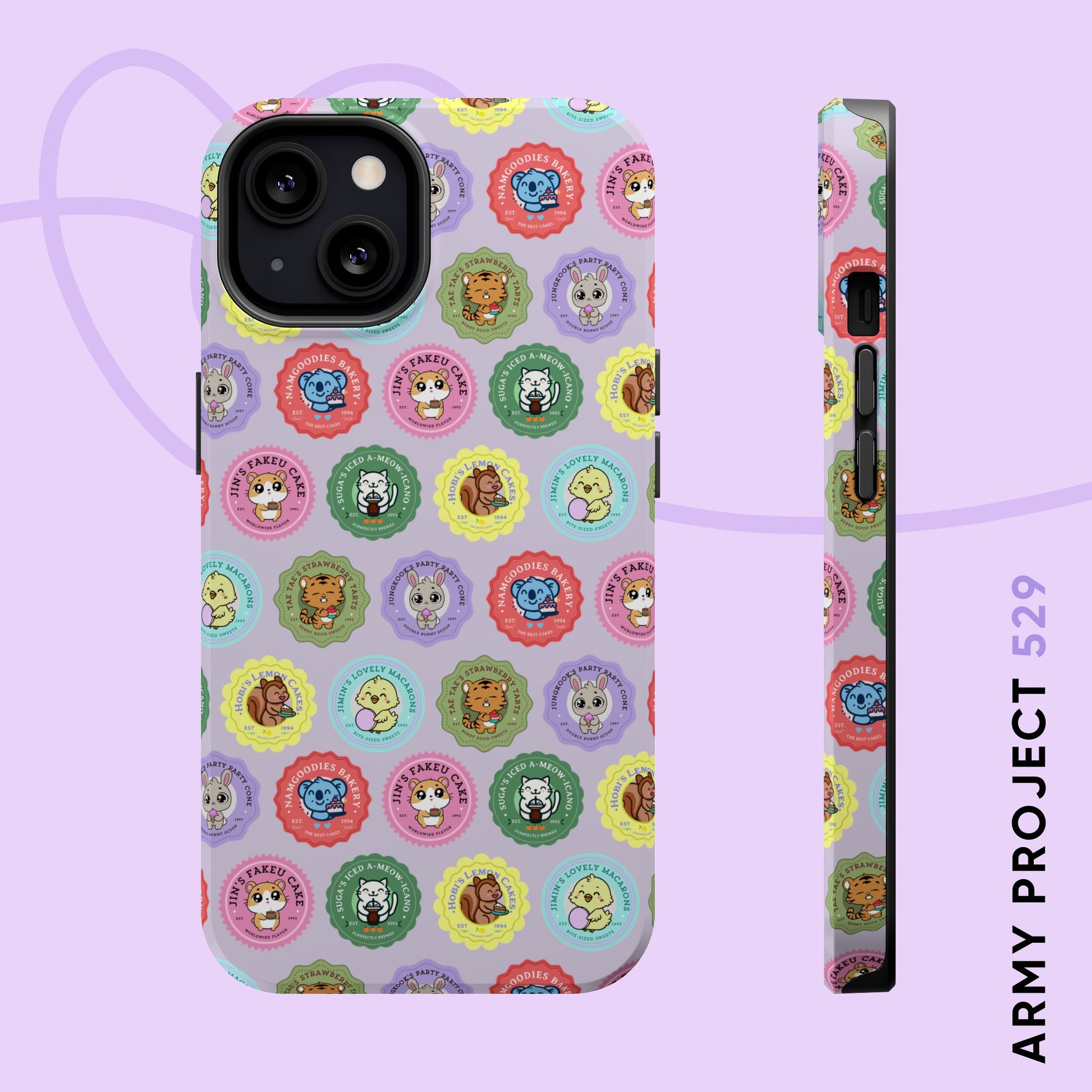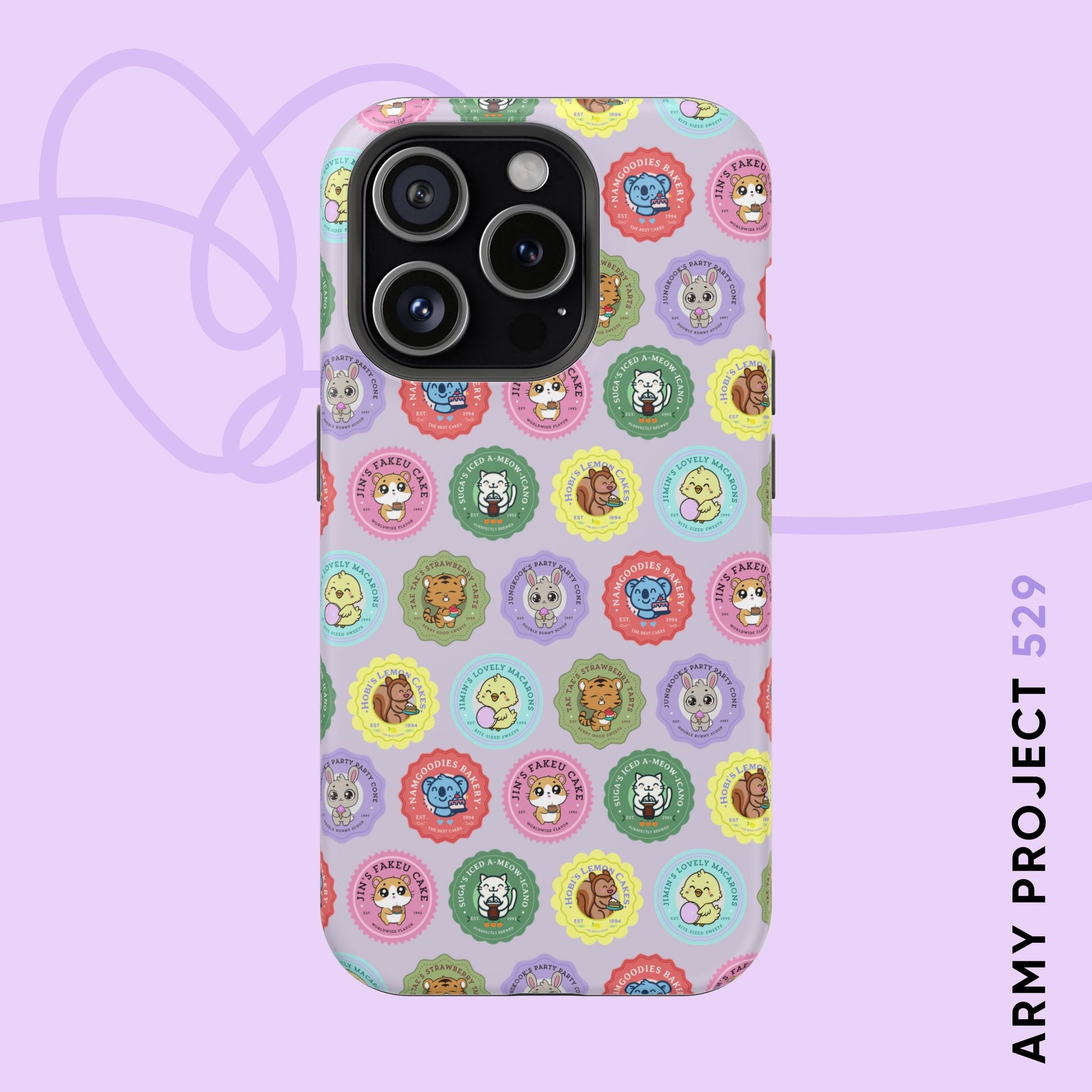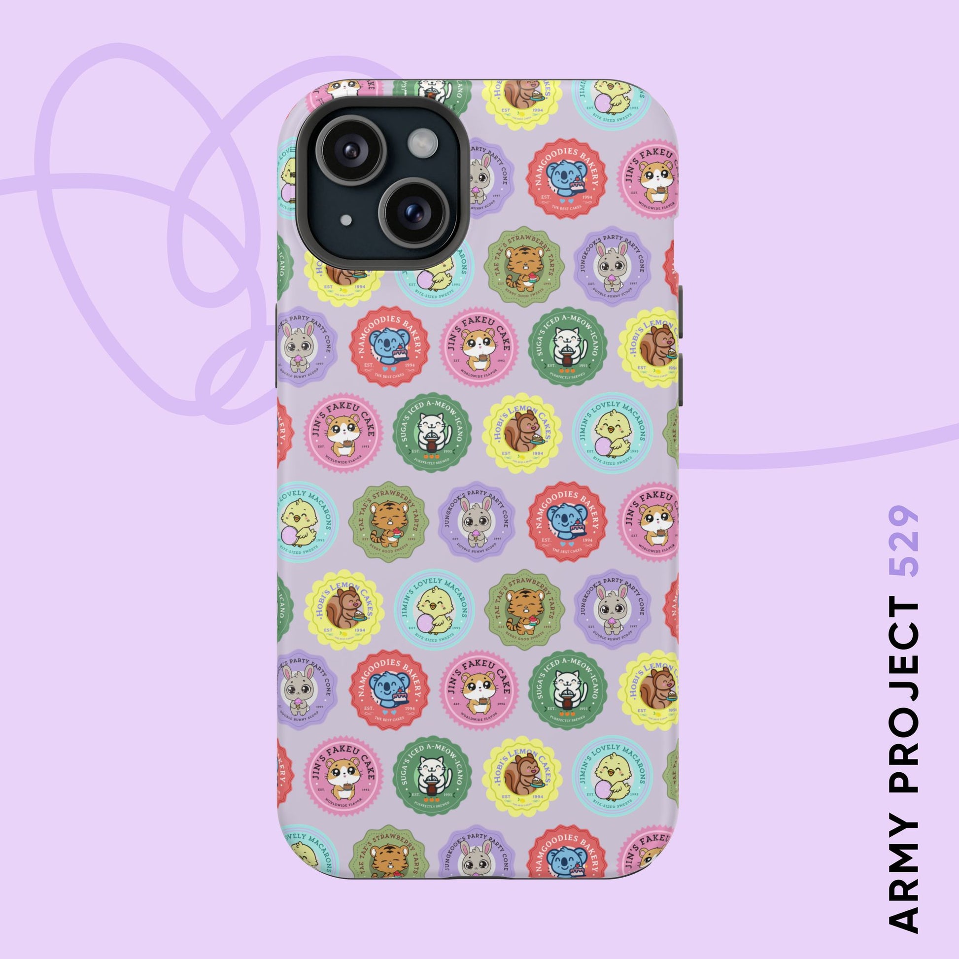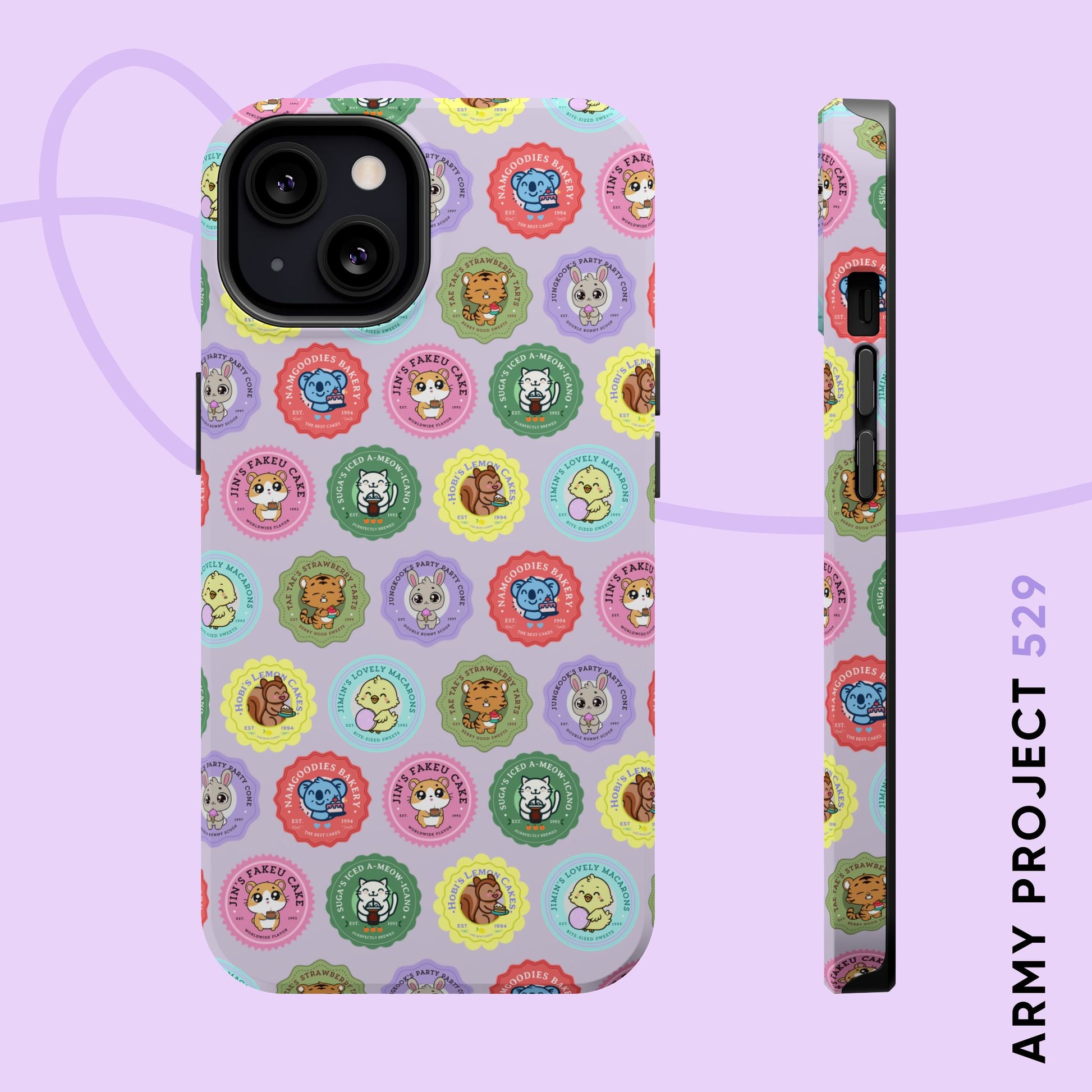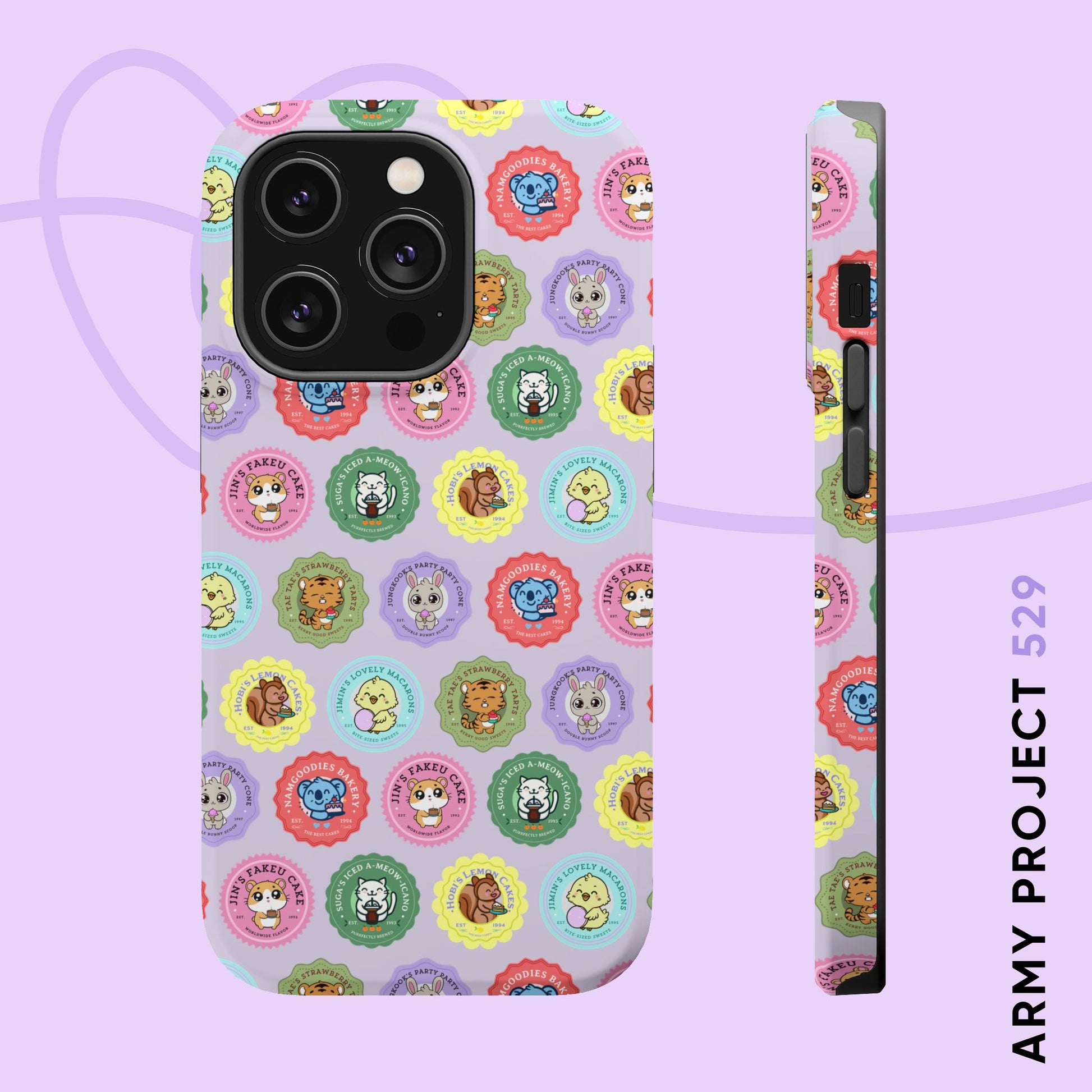 Protect your tech and showcase your ARMY pride with this adorable Namgoodies Bakery Magnetic Tough phone case! Featuring a seamless pattern of whimsical logos from Bangtan's imaginary bakery, the design is a sweet, subtle signal to other fans. Set against a soft purple background, the pattern is packed with cute chibi/kawaii-style animal mascots and fun references to the members' favorite foods, colors, and iconic phrases. This unique BTS fan-designed merchandise is the perfect way to carry a piece of the Bangtan Sonyeondan universe with you daily.