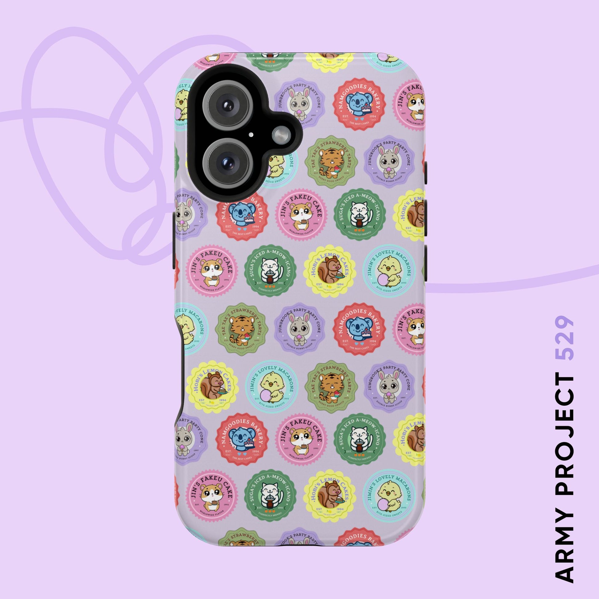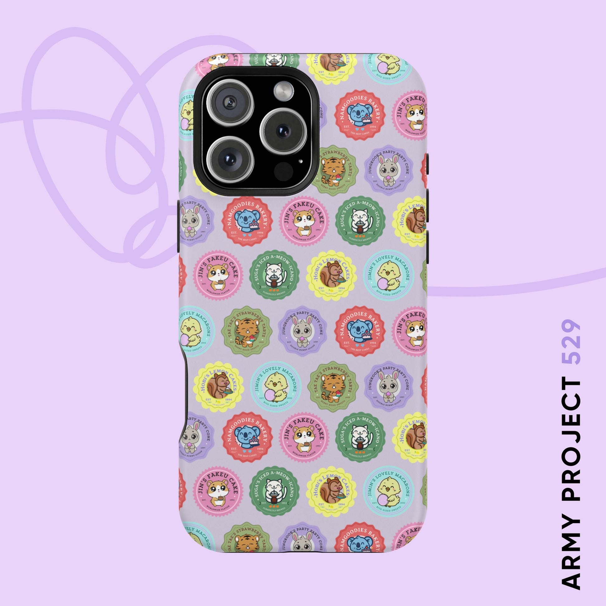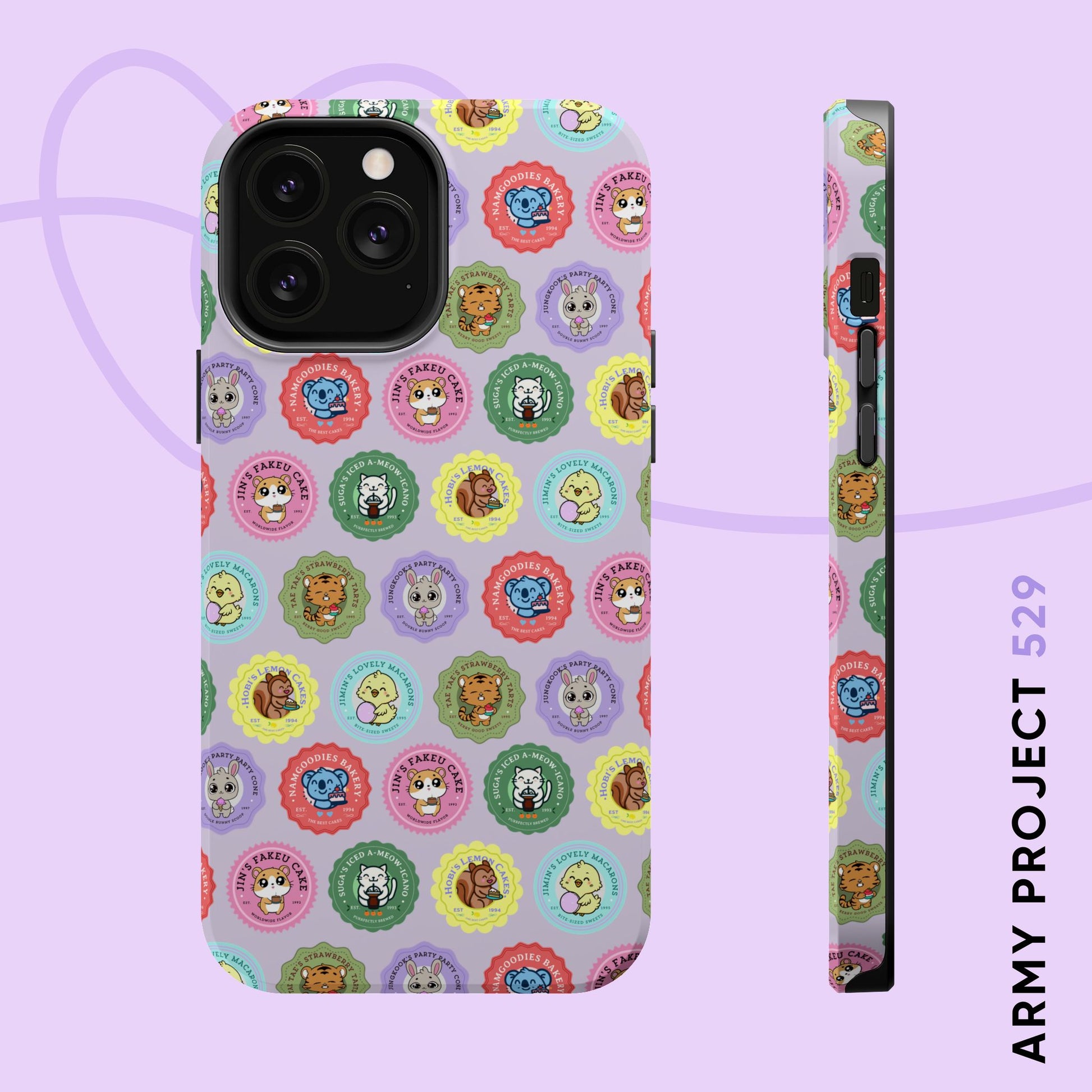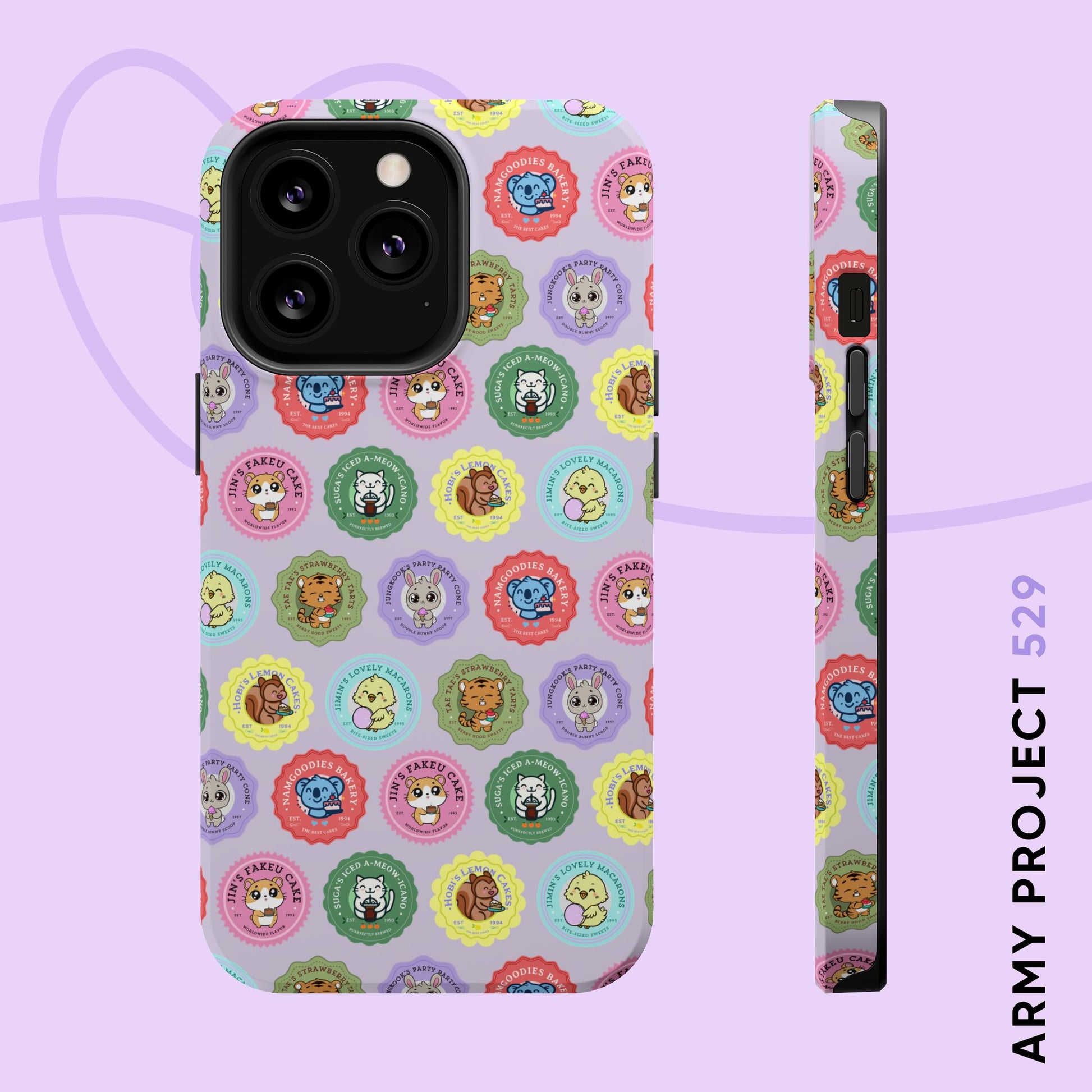 Protect your tech and showcase your ARMY pride with this adorable Namgoodies Bakery Magnetic Tough phone case! Featuring a seamless pattern of whimsical logos from Bangtan's imaginary bakery, the design is a sweet, subtle signal to other fans. Set against a soft purple background, the pattern is packed with cute chibi/kawaii-style animal mascots and fun references to the members' favorite foods, colors, and iconic phrases. This unique BTS fan-designed merchandise is the perfect way to carry a piece of the Bangtan Sonyeondan universe with you daily.