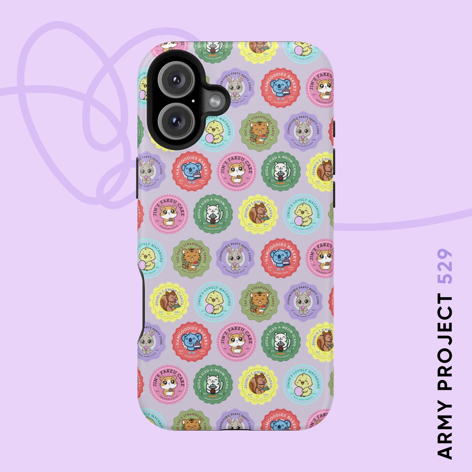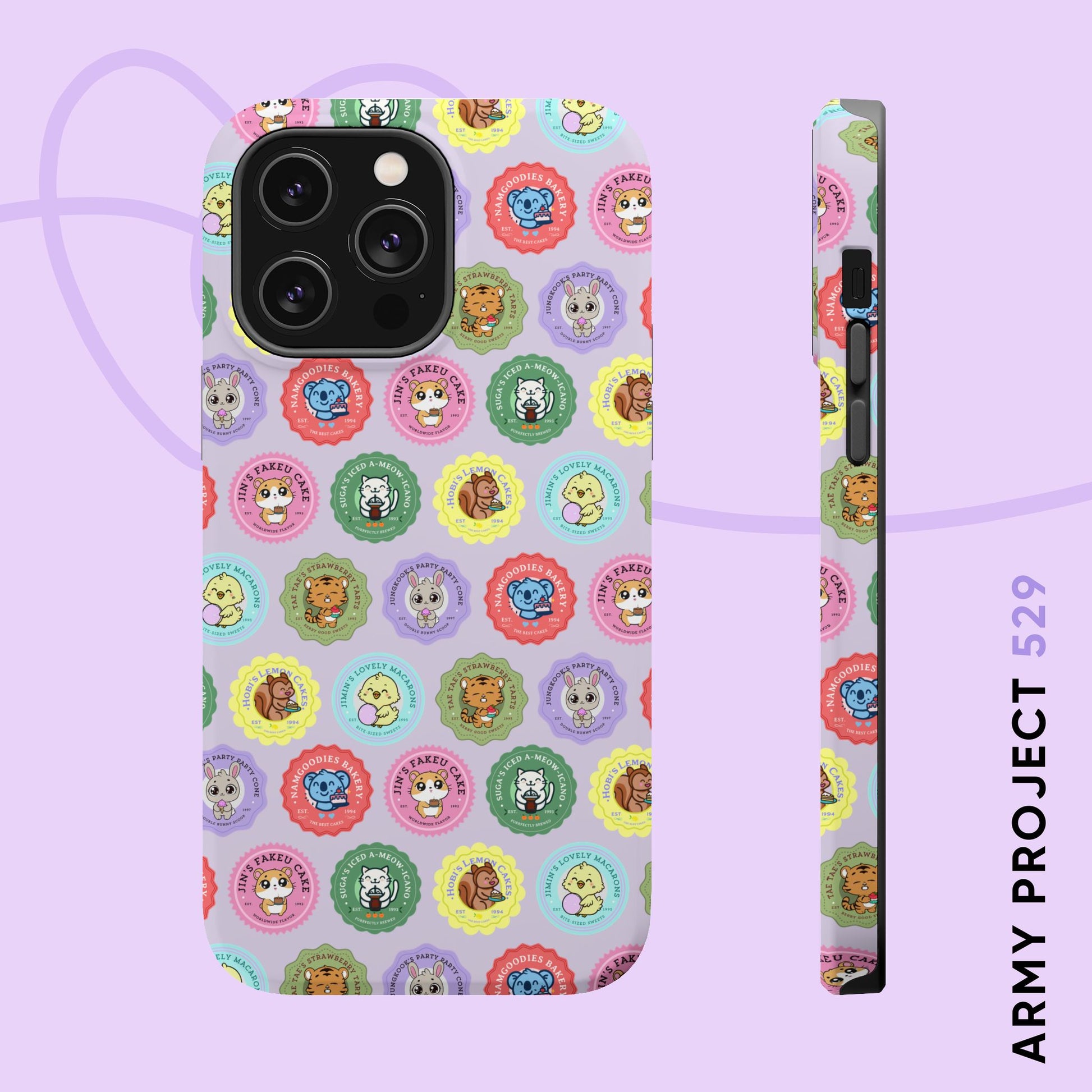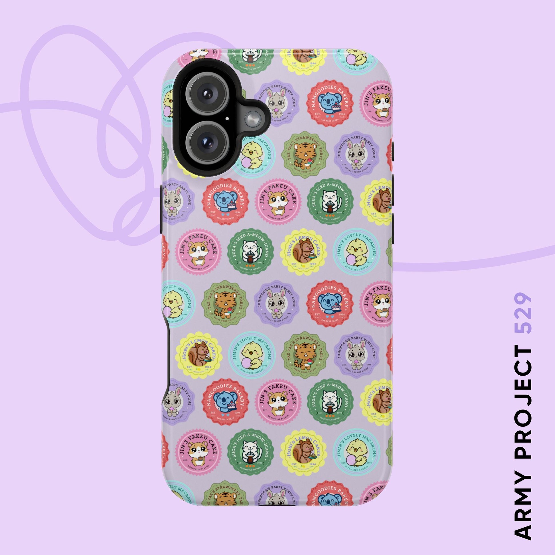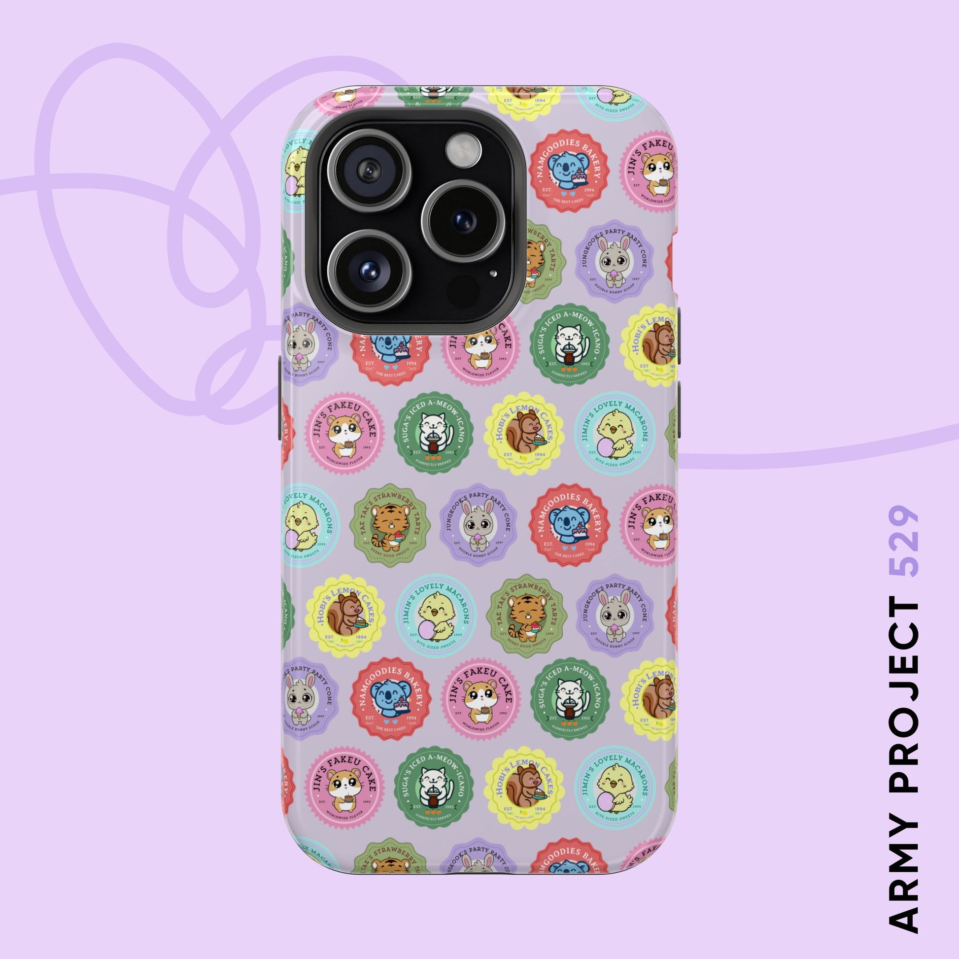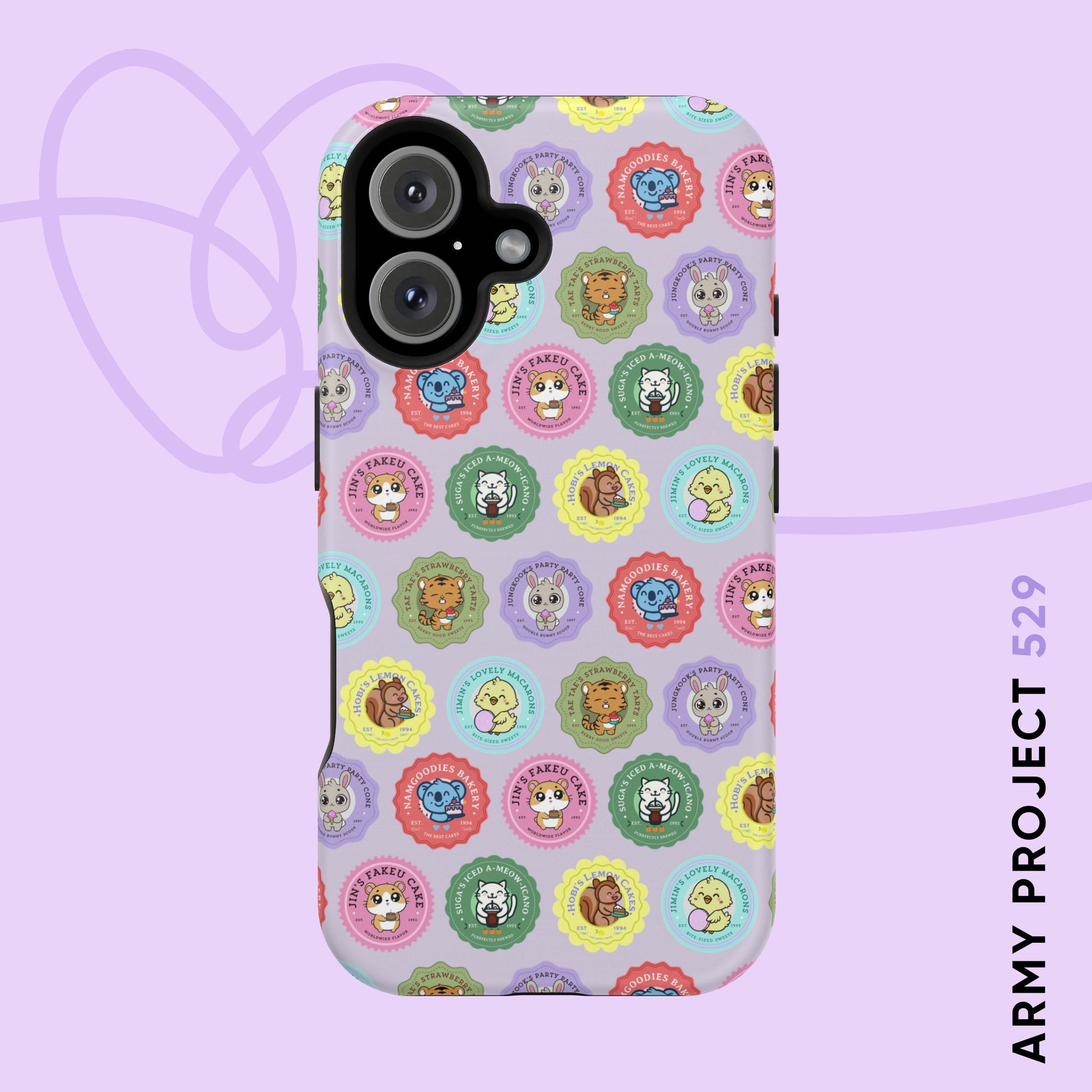 Protect your tech and showcase your ARMY pride with this adorable Namgoodies Bakery Magnetic Tough phone case! Featuring a seamless pattern of whimsical logos from Bangtan's imaginary bakery, the design is a sweet, subtle signal to other fans. Set against a soft purple background, the pattern is packed with cute chibi/kawaii-style animal mascots and fun references to the members' favorite foods, colors, and iconic phrases. This unique BTS fan-designed merchandise is the perfect way to carry a piece of the Bangtan Sonyeondan universe with you daily.