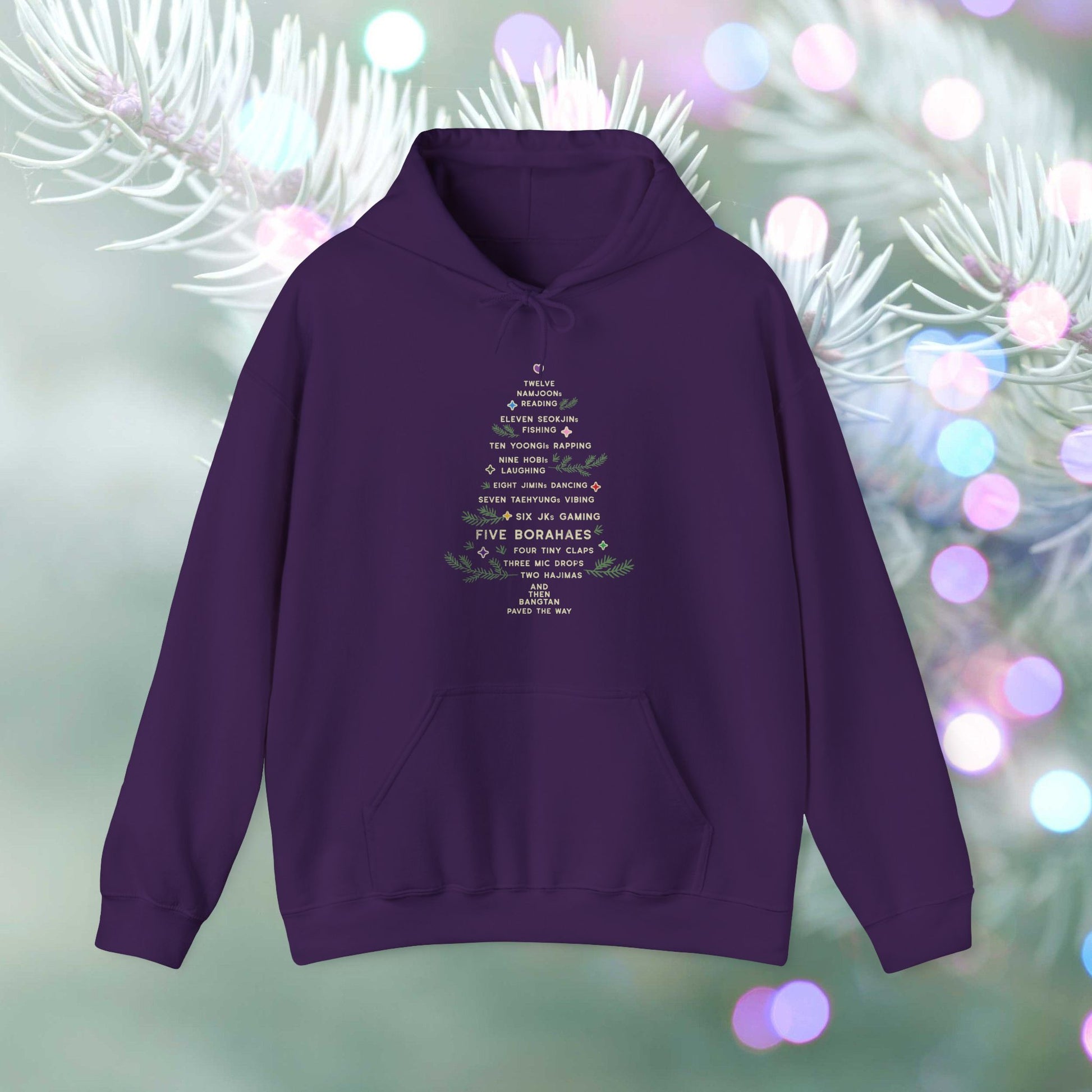 Get ready to jingle all the way with the 12 Days of Bangtan Hoodie, our fanmade BTS Christmas pullover sweatshirt for this holiday season! This design features a deconstructed Christmas tree made out of a BTS-themed version of the classic carol. Any ARMY will appreciate this design—because we all know BTS paved the way! Whether you're streaming old Run BTS episodes or attending a concert film, this retro vintage style hoodie is the perfect Bangtan holiday apparel to subtly signal your fandom to those in the know.