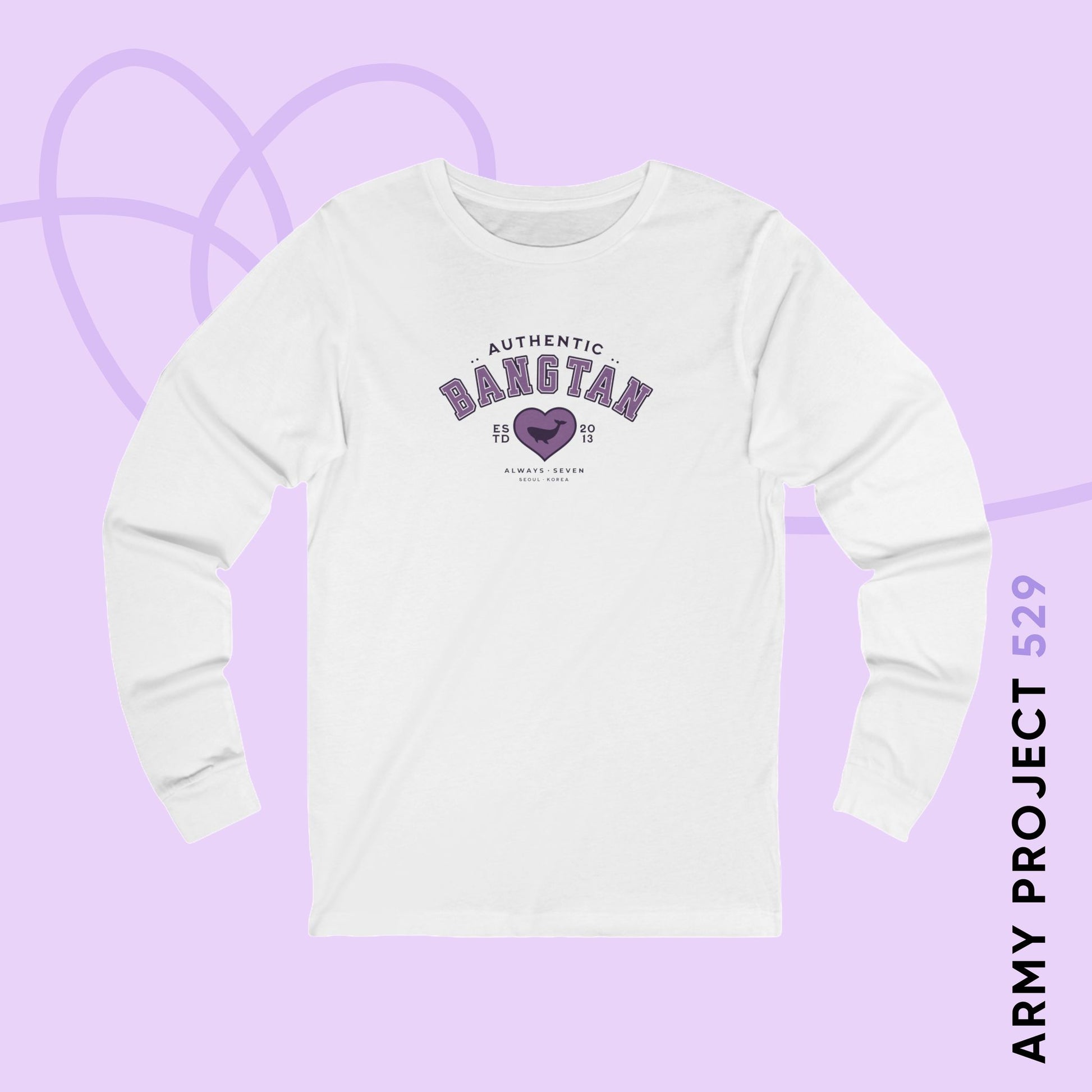 Step up your game with the exclusive Bangtan Athletics Long Sleeve Tee, a design that subtly signals your commitment to OT7. Featuring a classic, sporty design that proudly reads "Authentic Bangtan," this t-shirt is perfect for everyday wear. Originally created as a special anniversary gift for the ARMY Project 529 Admins, this fanmade BTS design has been requested by the community and is finally available to you.