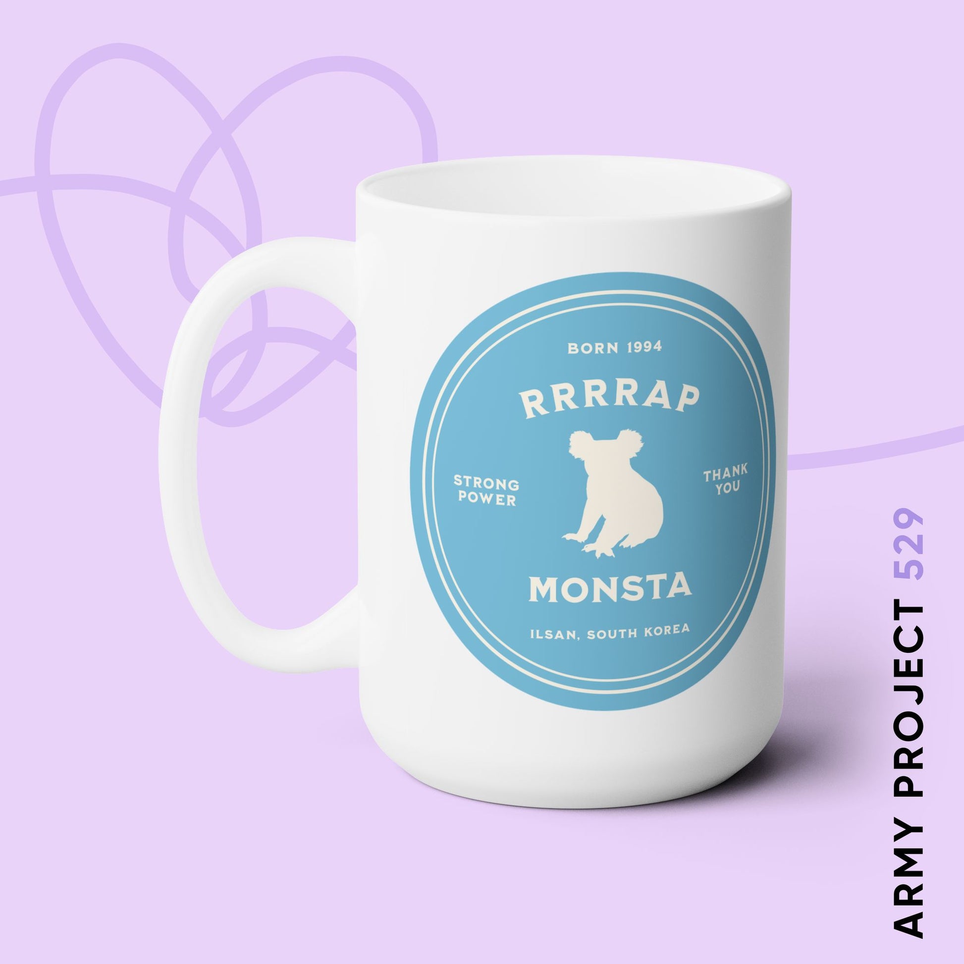 This mug features a timeless design created by our team, celebrating RM (Kim Namjoon) with his iconic Koala silhouette. Each element is a thoughtful nod to his identity and memorable moments:
