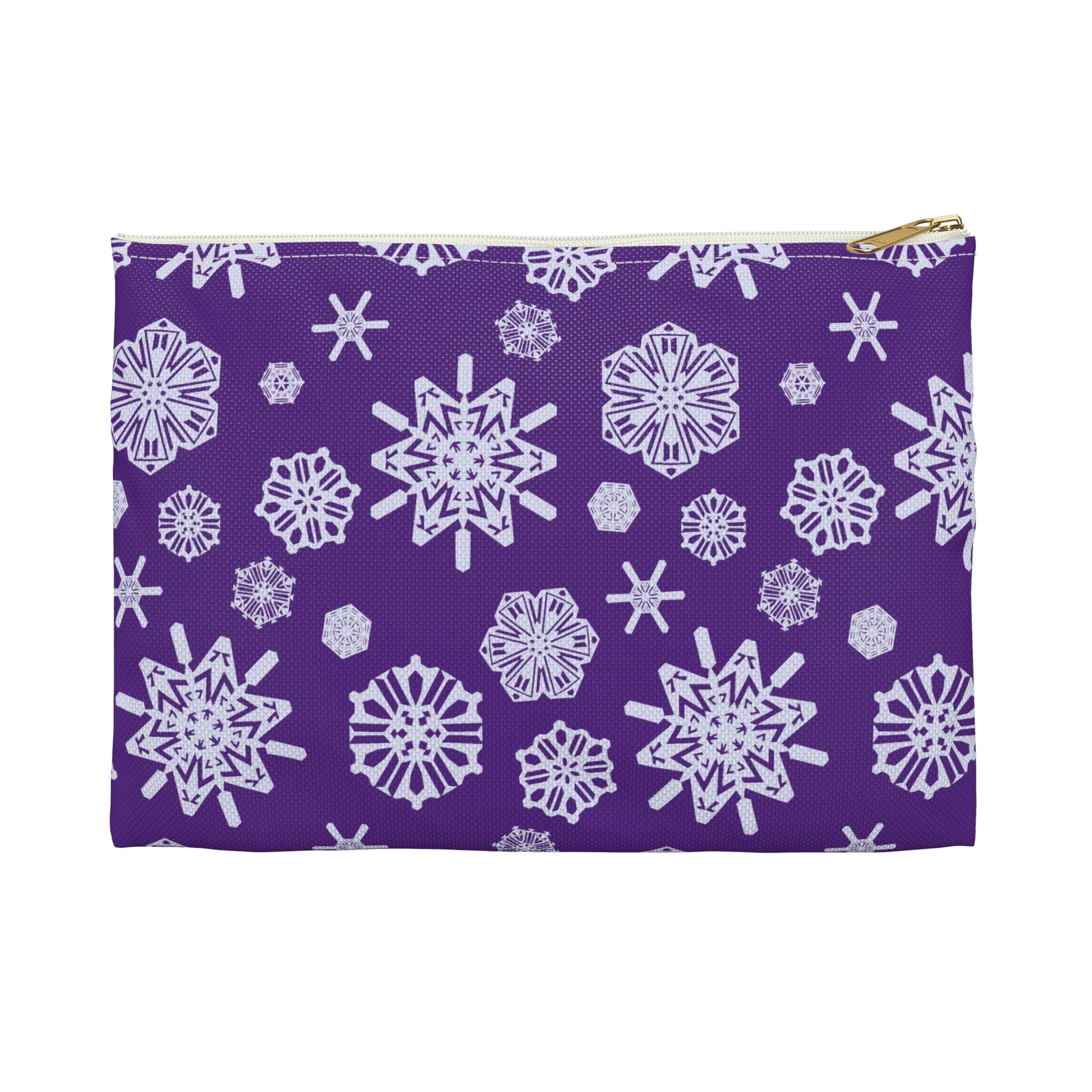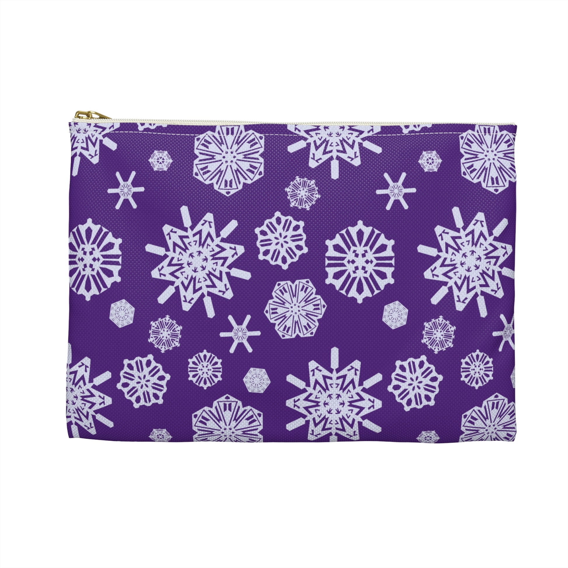 Travel in style this winter with the Secret Snowflakes Cosmetics Bag! This zippered accessory pouch features a gorgeous pattern of delicate white snowflakes scattered across a rich purple background. The design is cleverly crafted for the discerning fan: look closely, and you'll find hidden BTS and ARMY symbols—like the lucky number 7 and small hearts—embedded within the classic winter motif. This pouch is the ideal piece of fanmade BTS merch for any ARMY who loves beautiful and clever accessories.