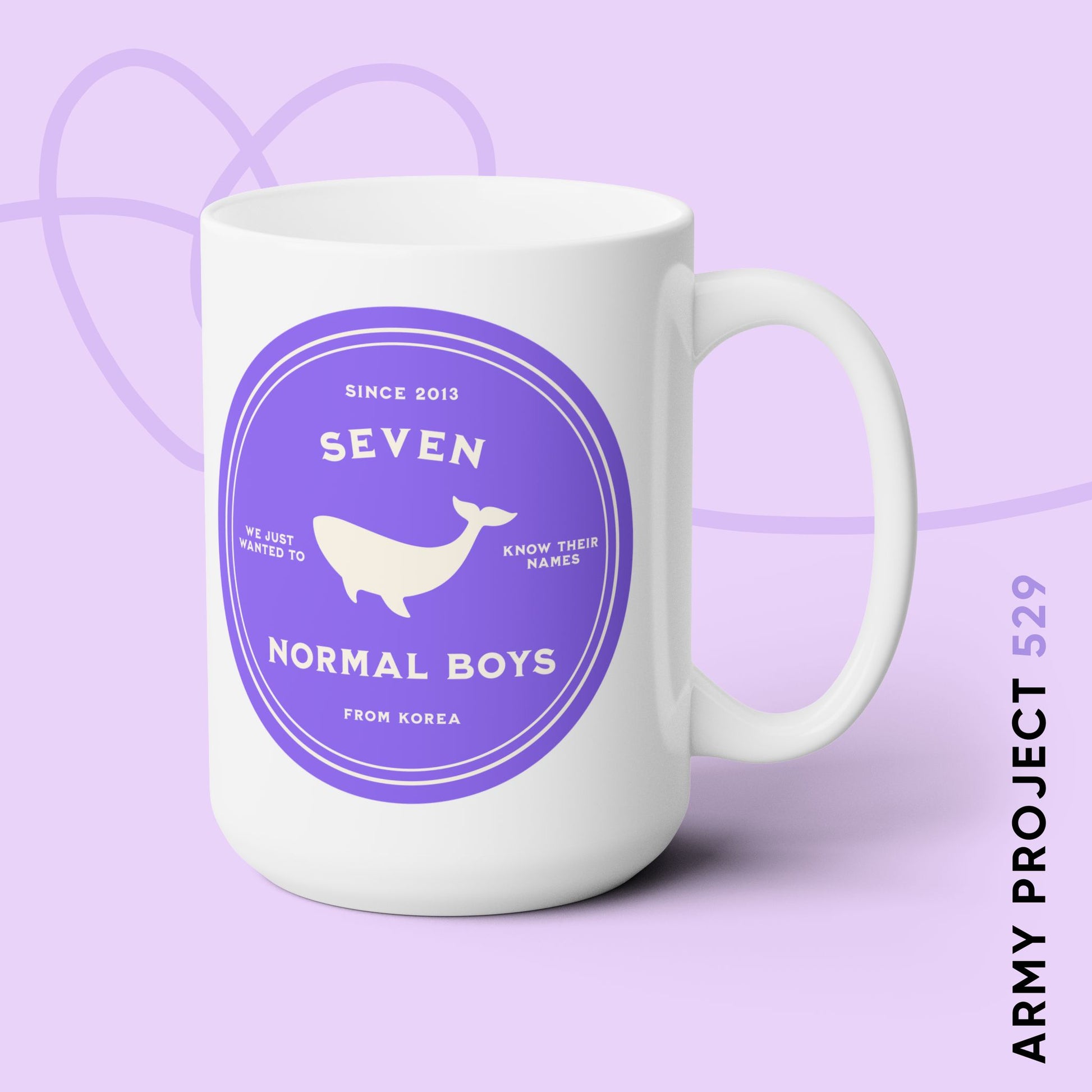 This mug features an original design created by our team, representing the whole of Bangtan with a symbolic Whale silhouette, nodding to the emotional song "Whalien 52." The text honors their journey and humble origins: