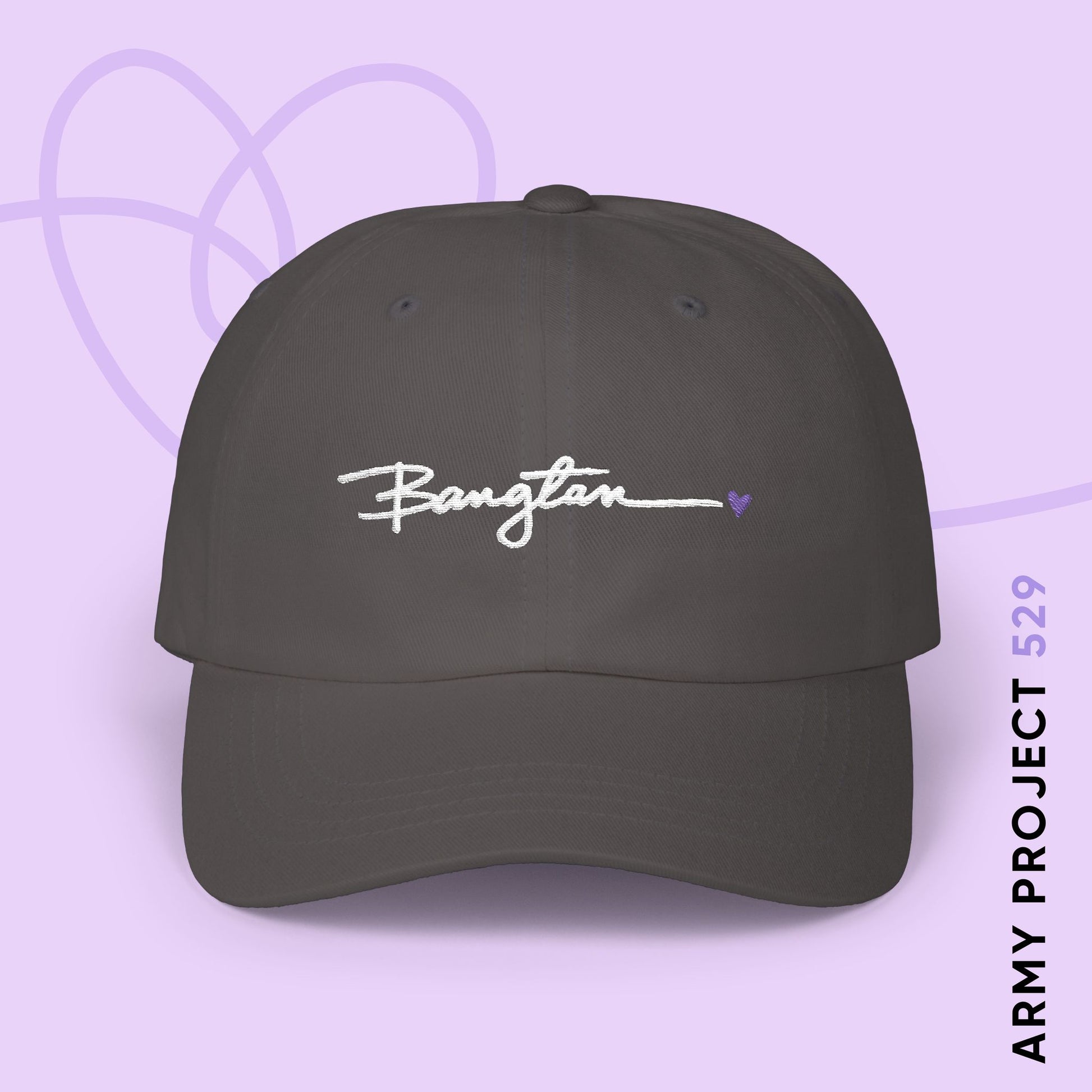 Wear your love for BTS every day with this unique embroidered Bangtan Handwritten Baseball Cap, created with a true ARMY's personal touch. This classic, low-profile hat features the word "Bangtan" beautifully embroidered in white using Christina's actual handwriting, complete with a small purple heart. It's the perfect subtle signal for fellow ARMY and a comfortable, everyday Bangtan hat that subtly celebrates your connection to BTS.