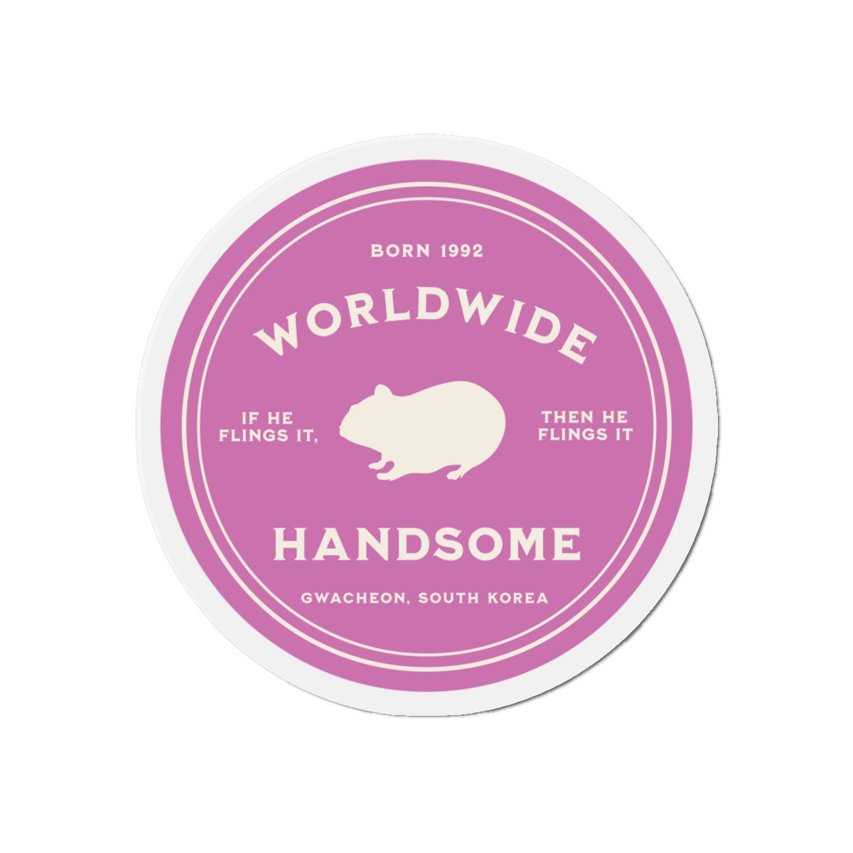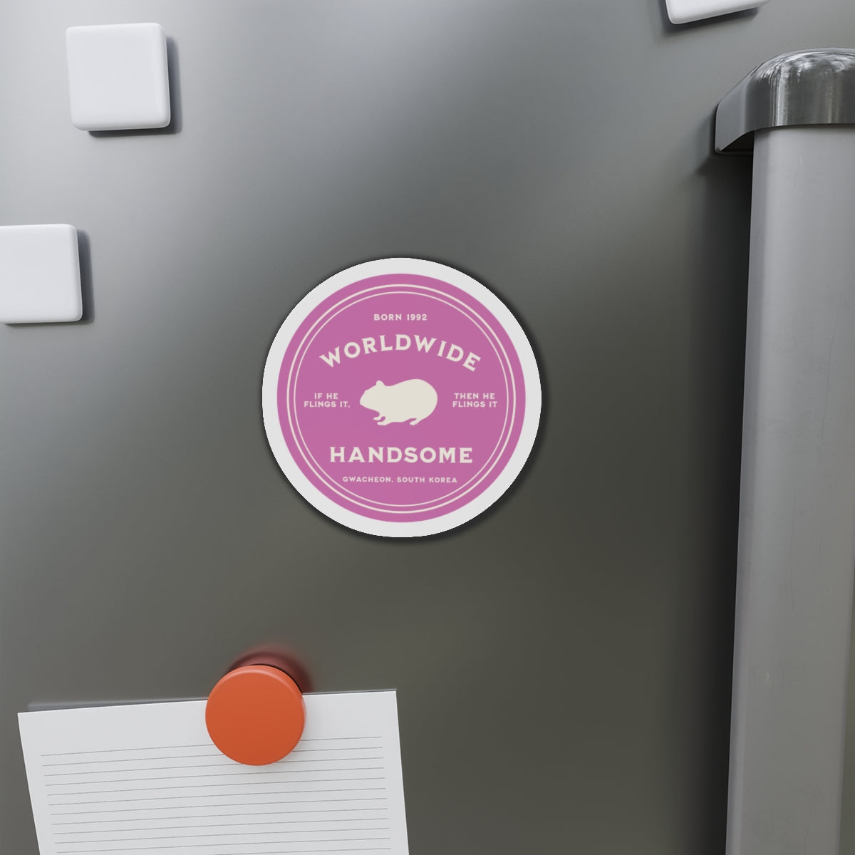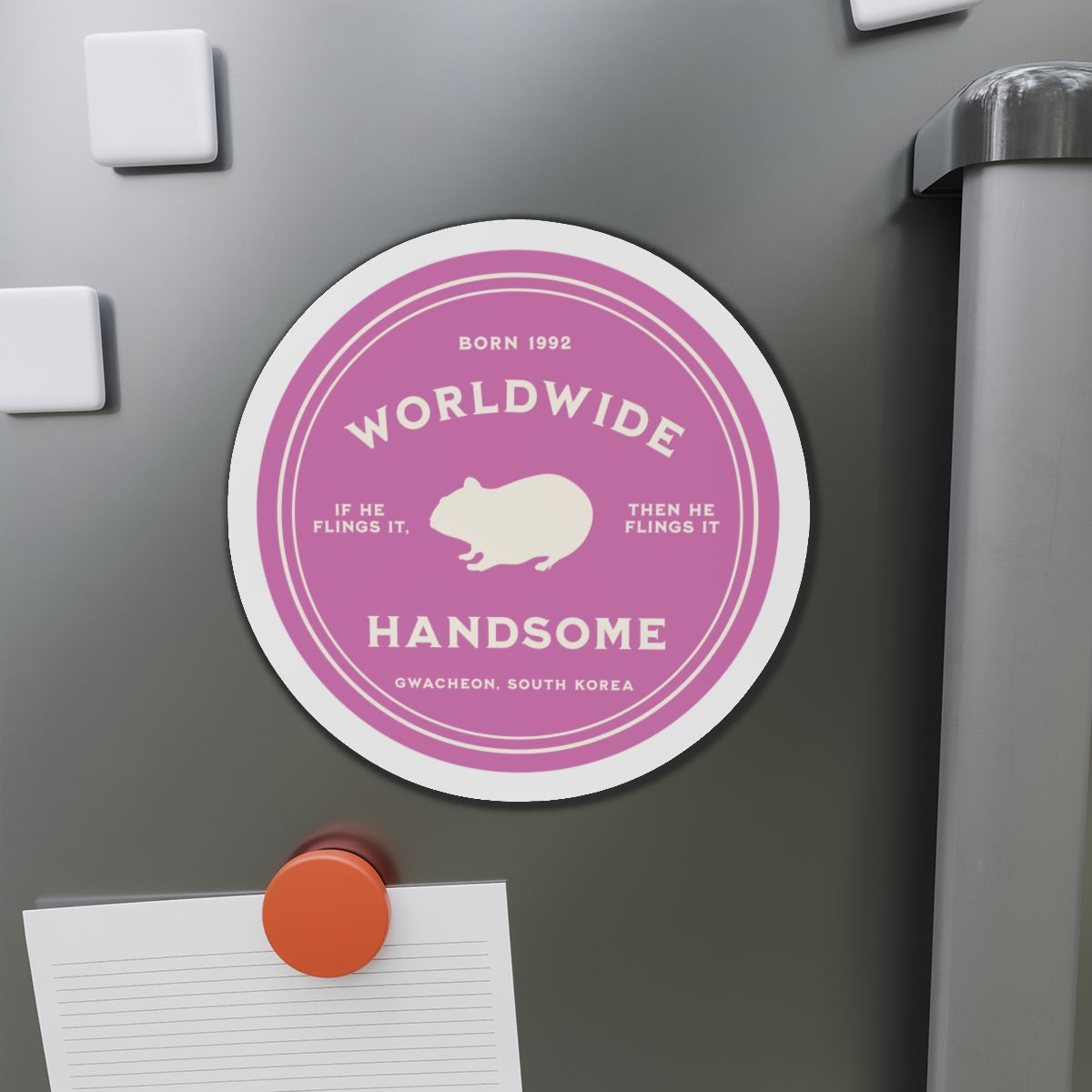 This magnet features an original design created by our own team, celebrating Jin (Kim Seokjin) with his endearing Hamster silhouette. Each element is a thoughtful nod to his encouraging persona: