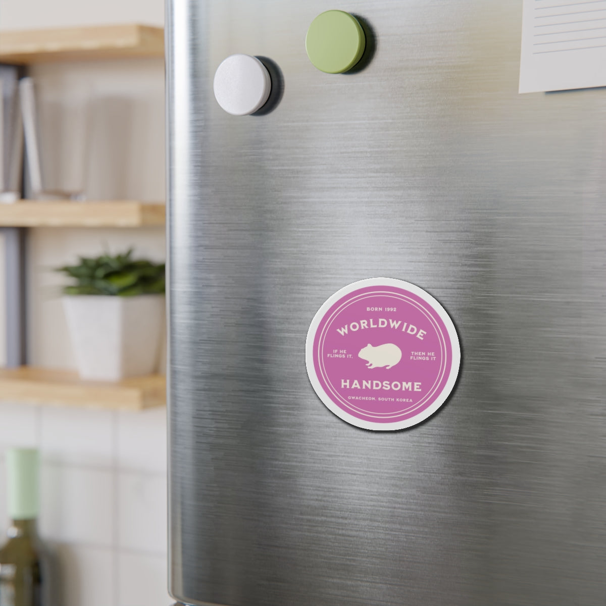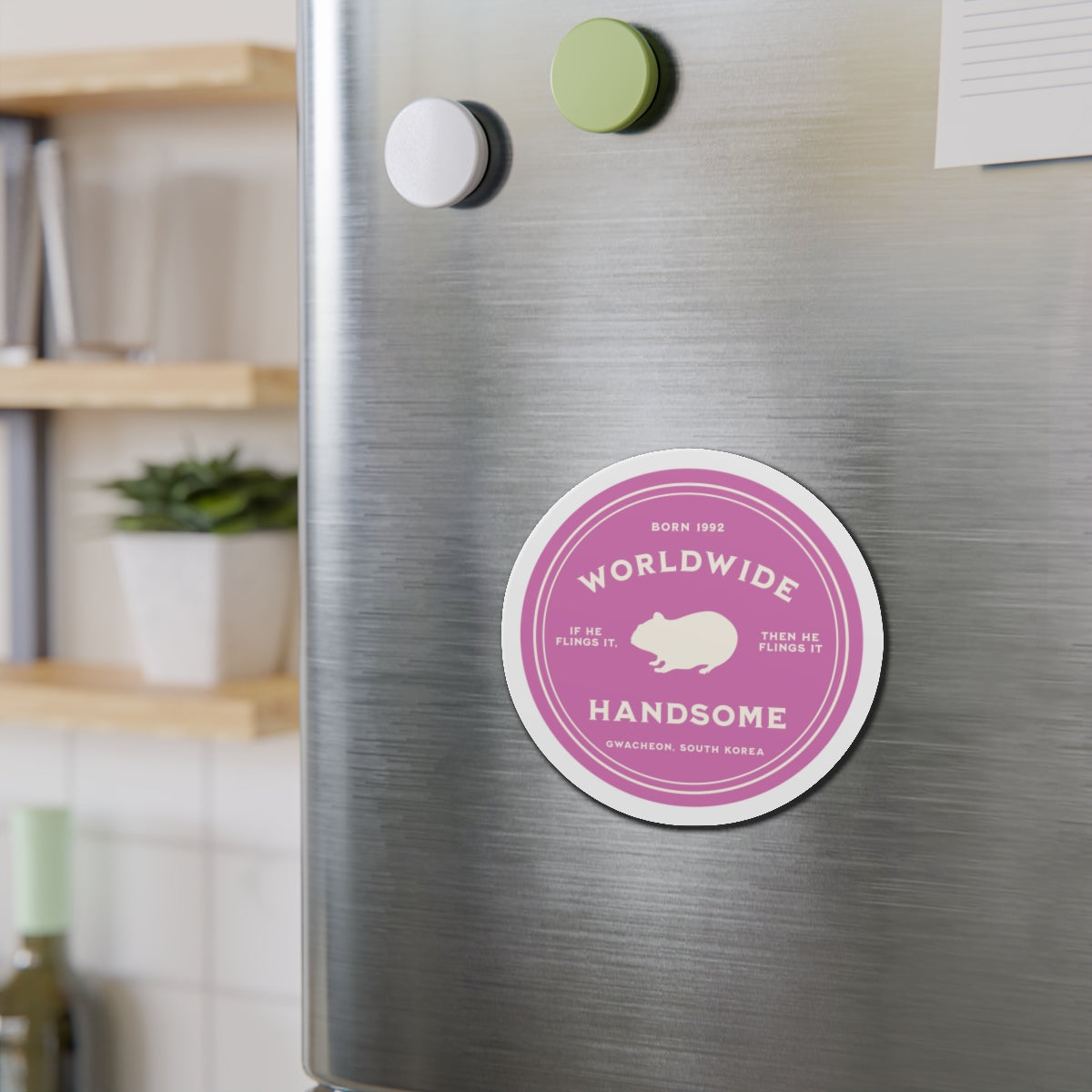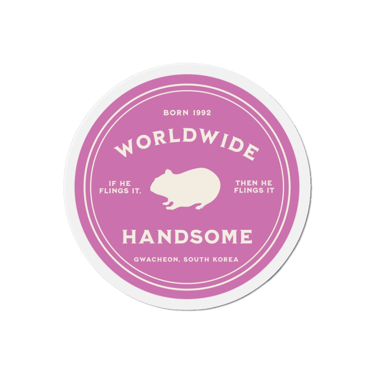 This magnet features an original design created by our own team, celebrating Jin (Kim Seokjin) with his endearing Hamster silhouette. Each element is a thoughtful nod to his encouraging persona: