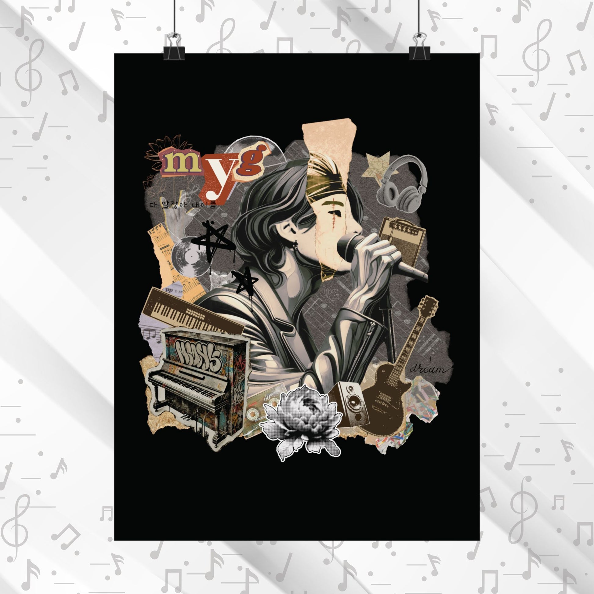 Rockstar Yoongi has us all falling in love with leather jackets and long hair! We used collage art and muted colors for the grungy 2010s vibe in this design. Part of our Retro Series, now complete for all seven members!
