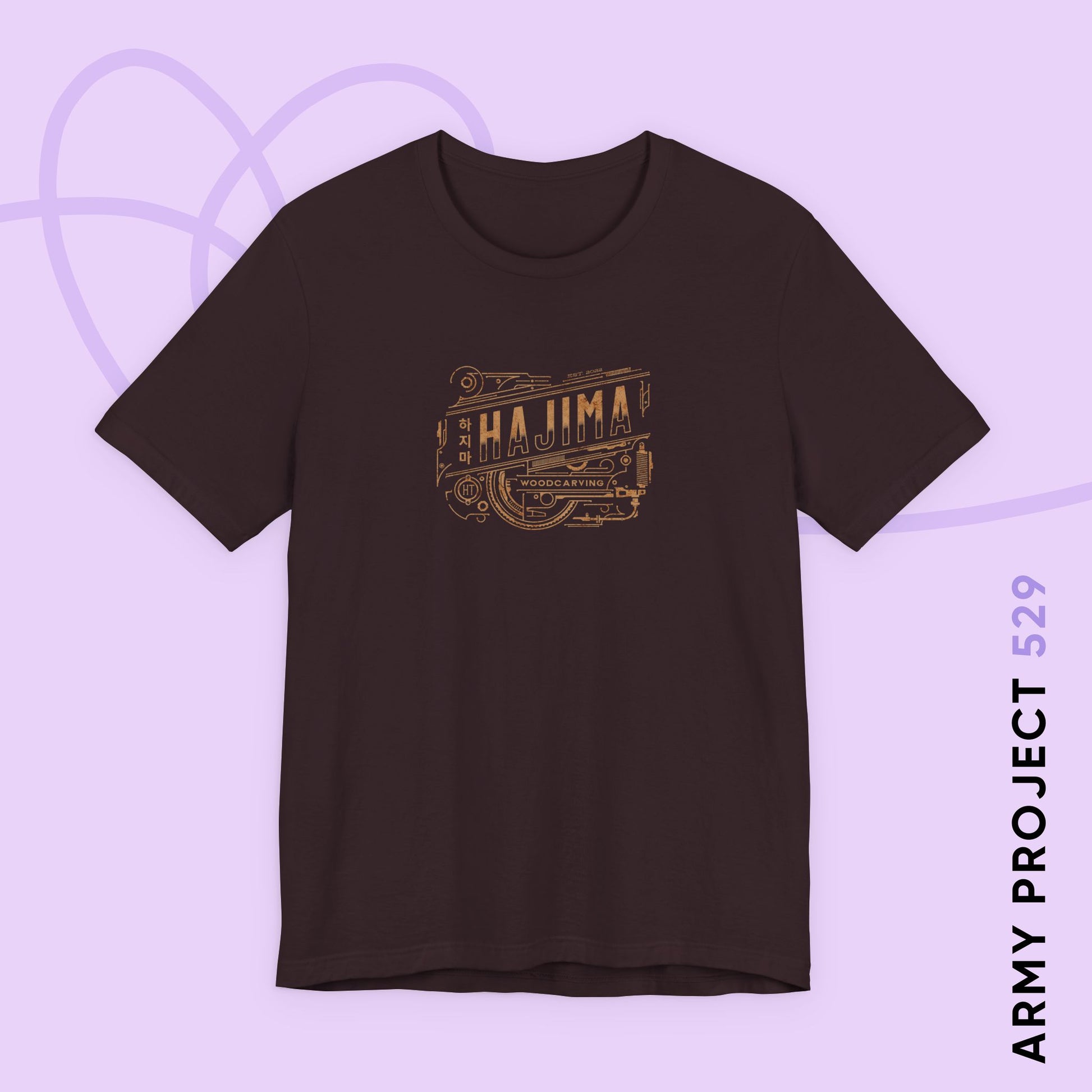 Whether you're cozying up to watch a BTS travel series or heading out for the day, this Woodcarving Hajima Short Sleeve Tee is the perfect subtle signal for fellow ARMY! This original design pays tribute to one of the most hilarious moments from In the Soop when Yoongi, ever the concerned hyung, desperately pleaded with Namjoon: "WOODCARVING HAJIMA!" Featuring industrial motifs inspired by Yoongi's love for woodworking and power tools, this fanmade BTS shirt captures the humor and heart of that moment. Available in two colorways—steel or bronze—this stylish fanmade BTS apparel also includes the Hangul for "hajima" (하지마).